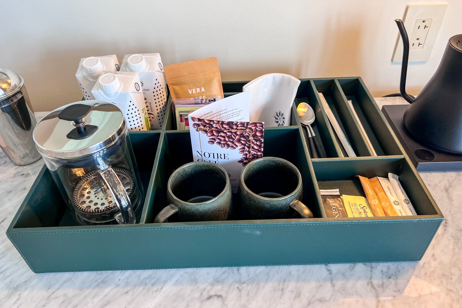 A large chest opposite the couch housed the minibar and complimentary boxed waters, tea and coffee for use in the in-room French press. The minibar included local and international brands for snacks and beverages.