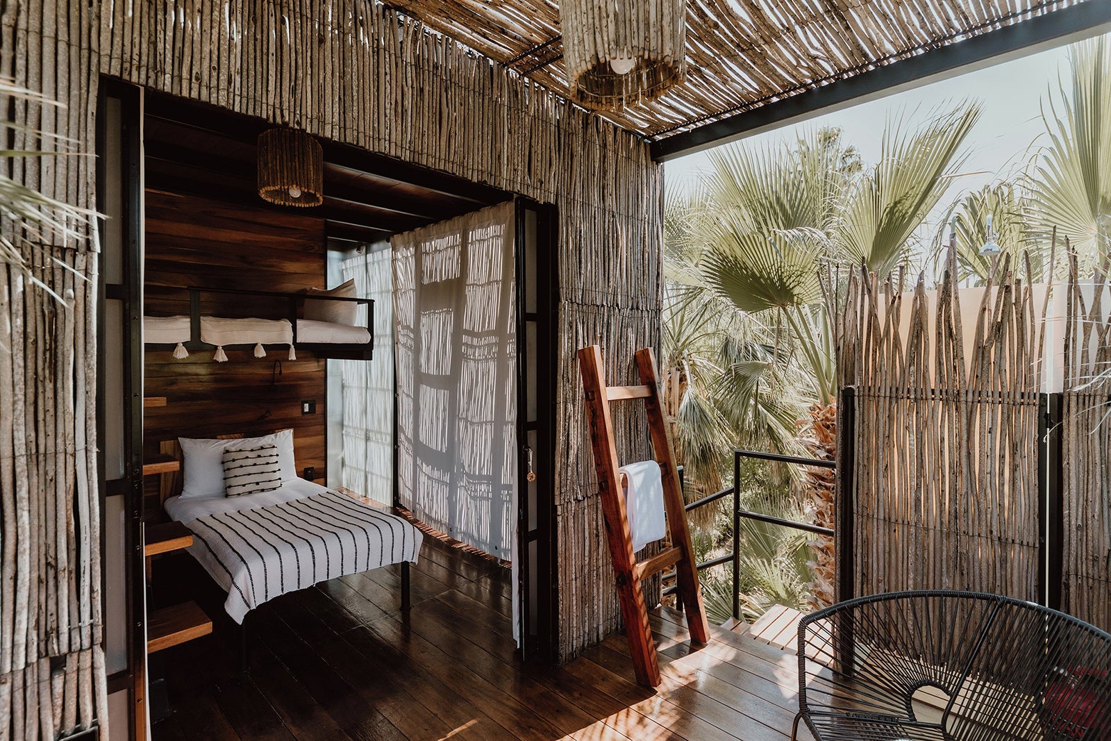 The treehouse rooms here draw visitors in with their Tulum-meets-desert aesthetic. Earthy and sophisticated, the treehouses feature thatched walls, outdoor showers and a boho-chic aesthetic.