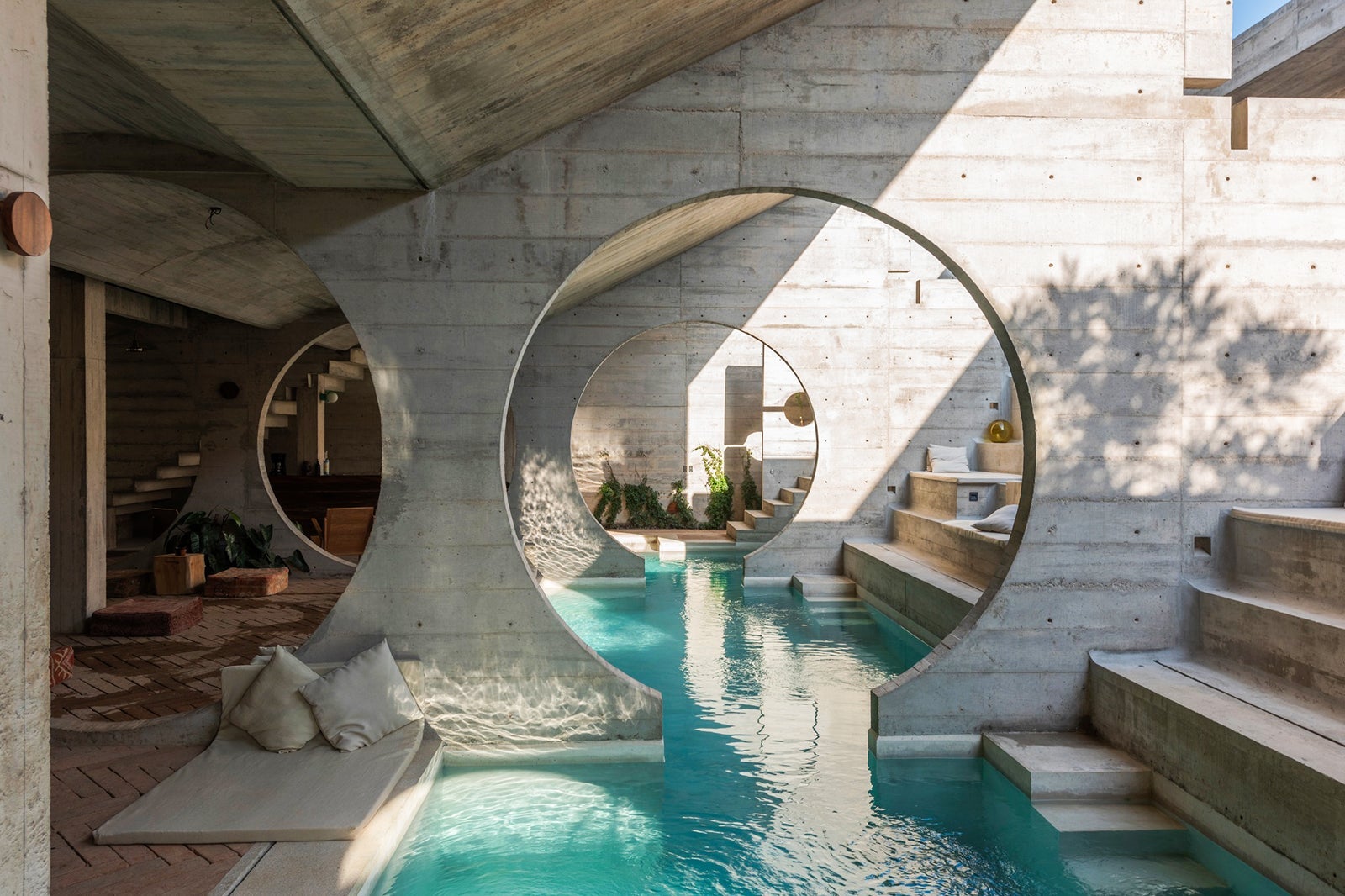 Inside, guests encounter a central patio with bamboo chairs and a beautiful, shimmering turquoise-colored pool divided by panels with circular cutouts, creating an underground cistern-style aesthetic. Rooms feature private terraces, while upper rooms have heated plunge pools.