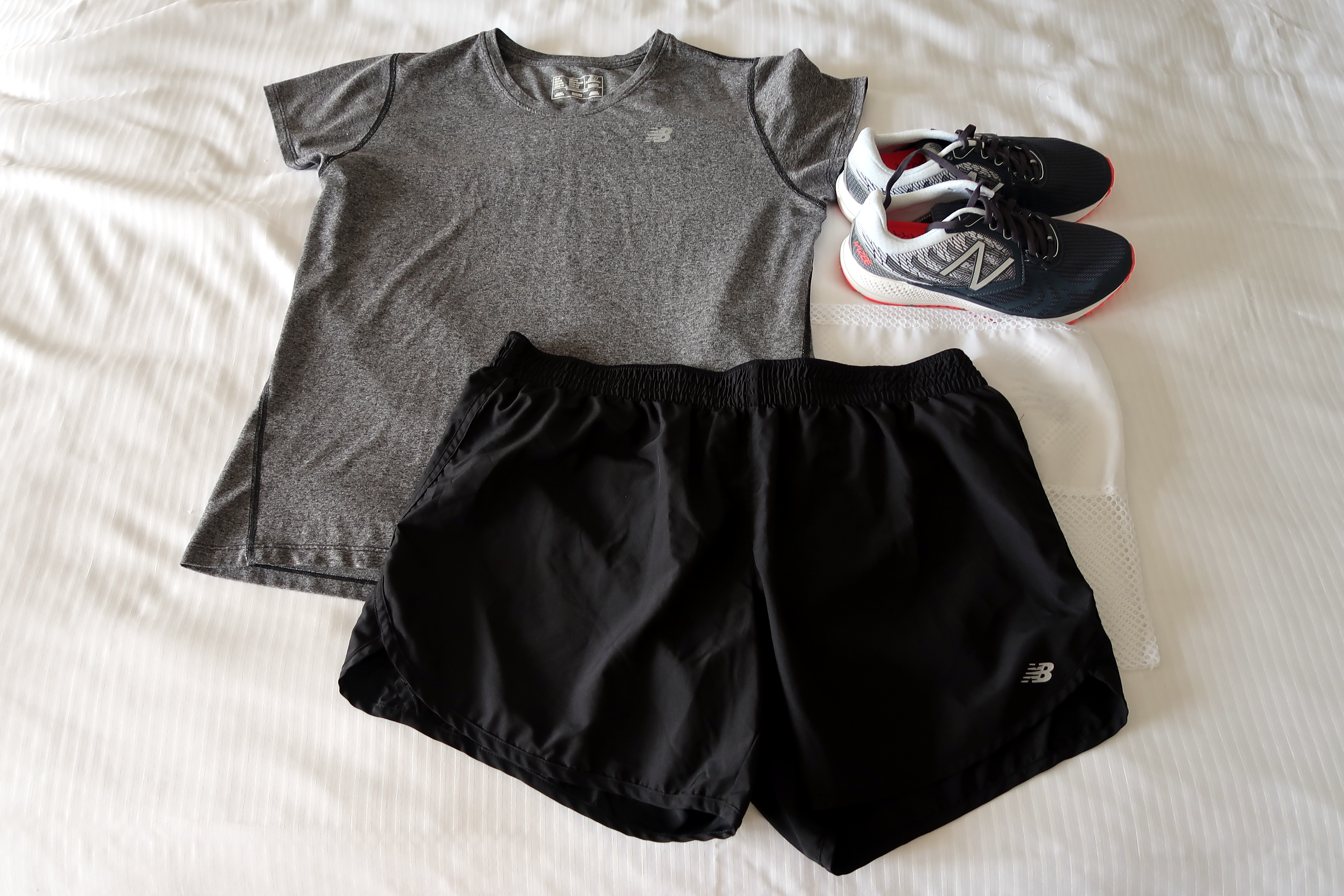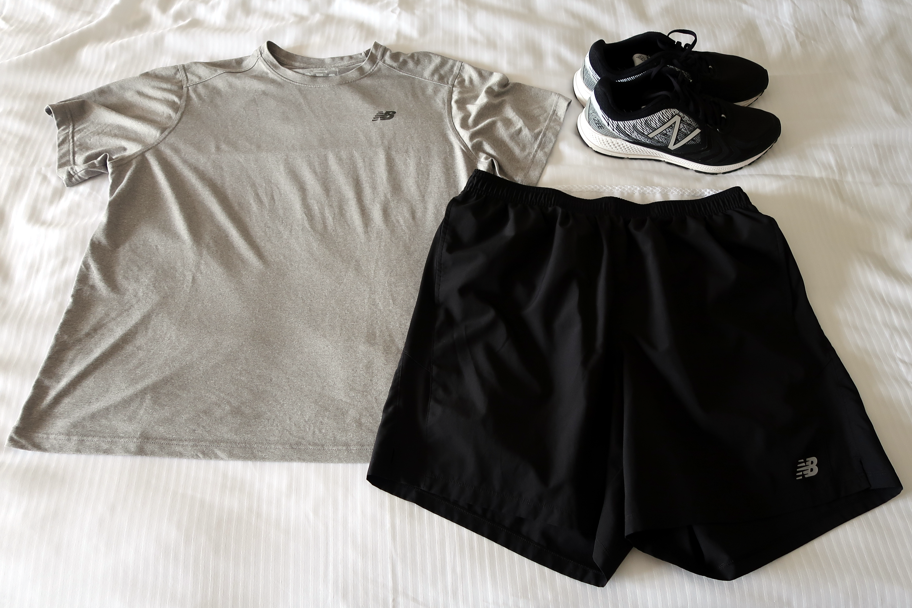 The clothing we received smelled freshly laundered and looked brand new. The shoes looked lightly used, but didn't have any notable smell or wear to them. As is often true with new New Balance shoes, we both found the arch support to be mildly uncomfortable at first -- but our feet quickly became accustomed to the shoes. The clothing fit as expected, and was so comfortable that I considered purchasing the shorts.