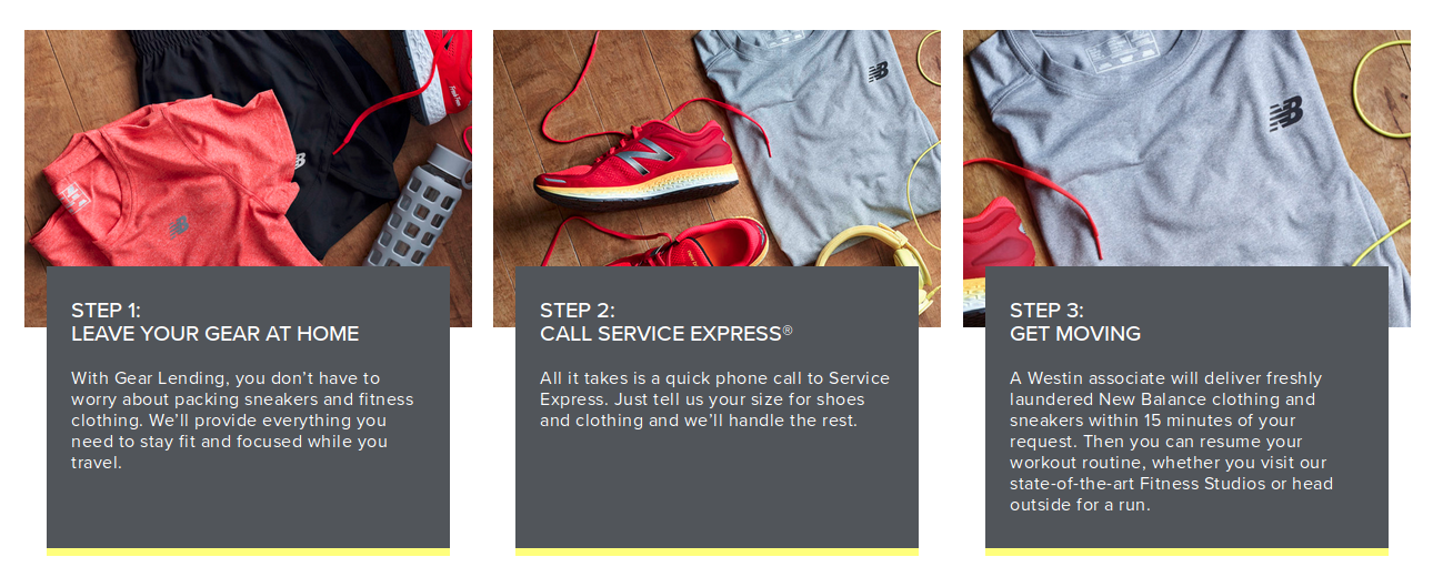Westin's Gear Lending program allows you to leave your workout clothing and running shoes at home by providing New Balance shoes and clothing for guests to borrow. For about $5 per stay, Westin will provide you with New Balance workout gear -- a shirt, shorts, running shoes and socks -- in your desired size. These items are yours to use throughout your stay; you simply leave them in your room when you checkout.