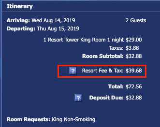 Room rates in August for the Excalibur are currently advertised at anywhere from $29 to $199 per night. If you think you've scored a great deal for $29, you'll be hit with a $35 per night resort fee, also taxed, more than doubling the advertised room rate. In fact, a room rate actively marketed across every MGM channel as costing $29 ends up as $72.56 when it is all said and done.