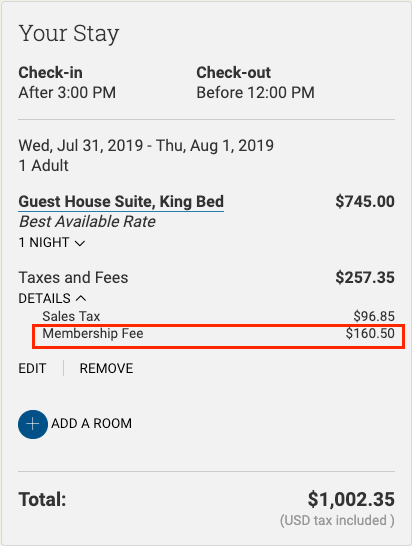 The Fisher Island Hotel and Resort has a $160.50 per night "Membership Fee" that is not included in advertised room rates. I could not find a breakout anywhere on the site of what this is or why it is included. I called the Fisher Island hotel front desk and asked for a definition of the Membership Fee. The agent responded that it granted temporary membership to the island and its facilities because nowhere else on the island took a credit card.