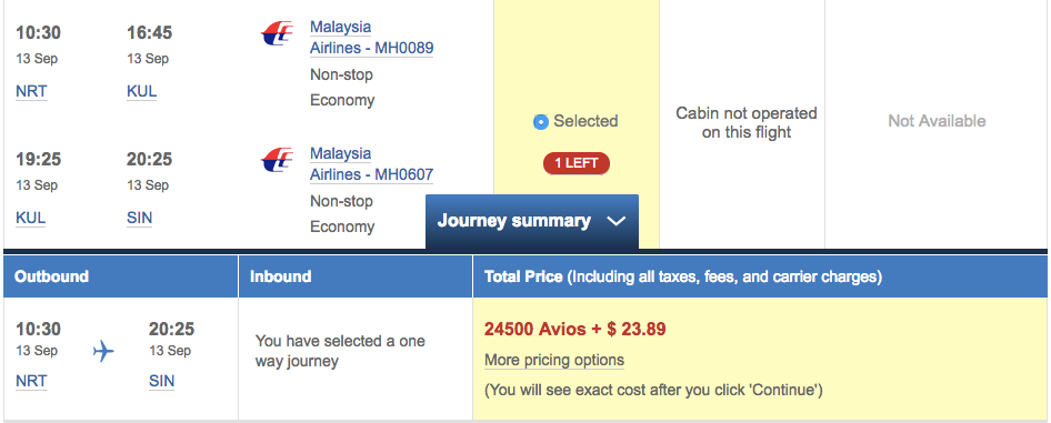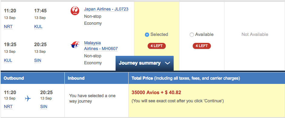 The cost when flying only Malaysia Airlines is 20,000 Avios for NRT-KUL and 4,500 Avios for KUL-SIN. Remember you're charged per segment, so enjoy a stopover in Kuala Lumpur for no extra Avios if you like. If you fly the exact same routing but use Japan Airlines for the first leg and Malaysia Airlines for the second leg, your price increases 10,500 Avios: