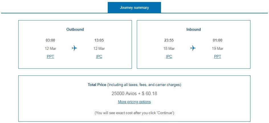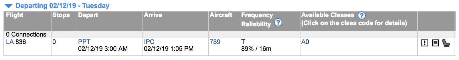However, LATAM does operate a once-weekly flight to Easter Island (IPC) from Tahiti (PPT), and those flights do show decent availability — for only 12,500 Avios each way!