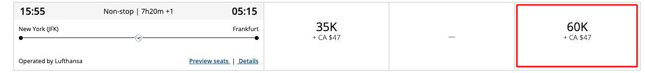 In the example above, New York-JFK to Frankfurt, Germany (FRA), on Lufthansa is 60,000 Aeroplan points (under 4,000 miles in distance) and a modest 47 Canadian dollars ($31) in taxes and fees. While you'll need to top up your account slightly, you'll be able to get maximum value out of your 50,000-point certificate.