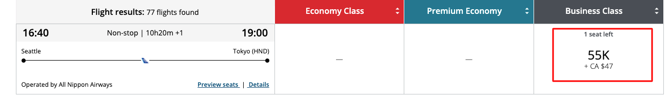 Air Canada partner awards between North America and Asia cost between 55,000 and 105,000 points in business, depending on the total distance. Take, for instance, a flight from Seattle (SEA) to Tokyo (HND) operated by ANA. This route is just under 5,000 miles in distance, so a business-class ticket would cost 55,000 points. In this case, you'll need a 5,000-point top-up.