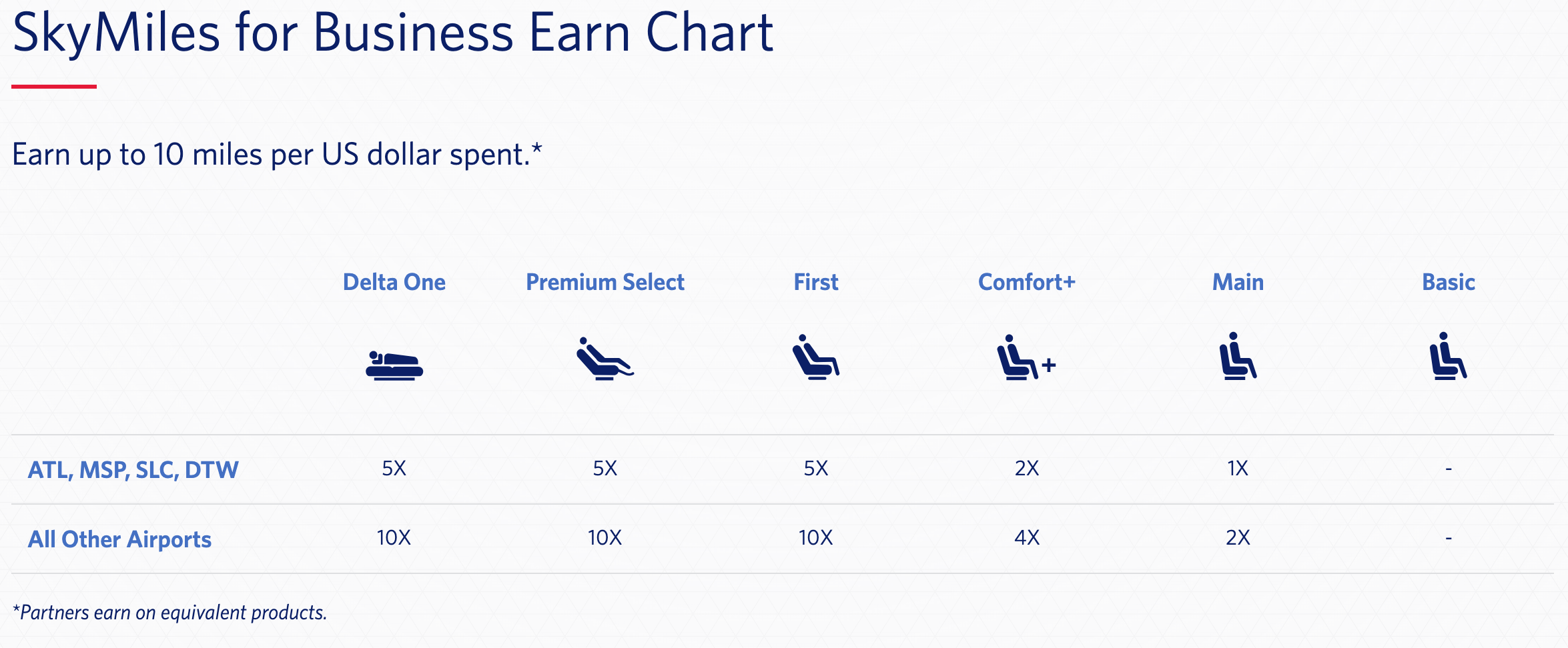 If you meet the criteria of the Plus and Elite tiers, your company will earn SkyMiles on flights and upgrades with Delta and select partner airlines (Air France, KLM, Virgin Atlantic and Aeromexico). The earning rate depends on the fare class and departure airport — from 1 mile per dollar spent on main cabin tickets that depart from select hubs to 10 miles per dollar spent on first- and business-class flights from nonhub airports (basic economy fares don't earn miles). Meanwhile, your employees who fly will continue to earn SkyMiles in their individual accounts.