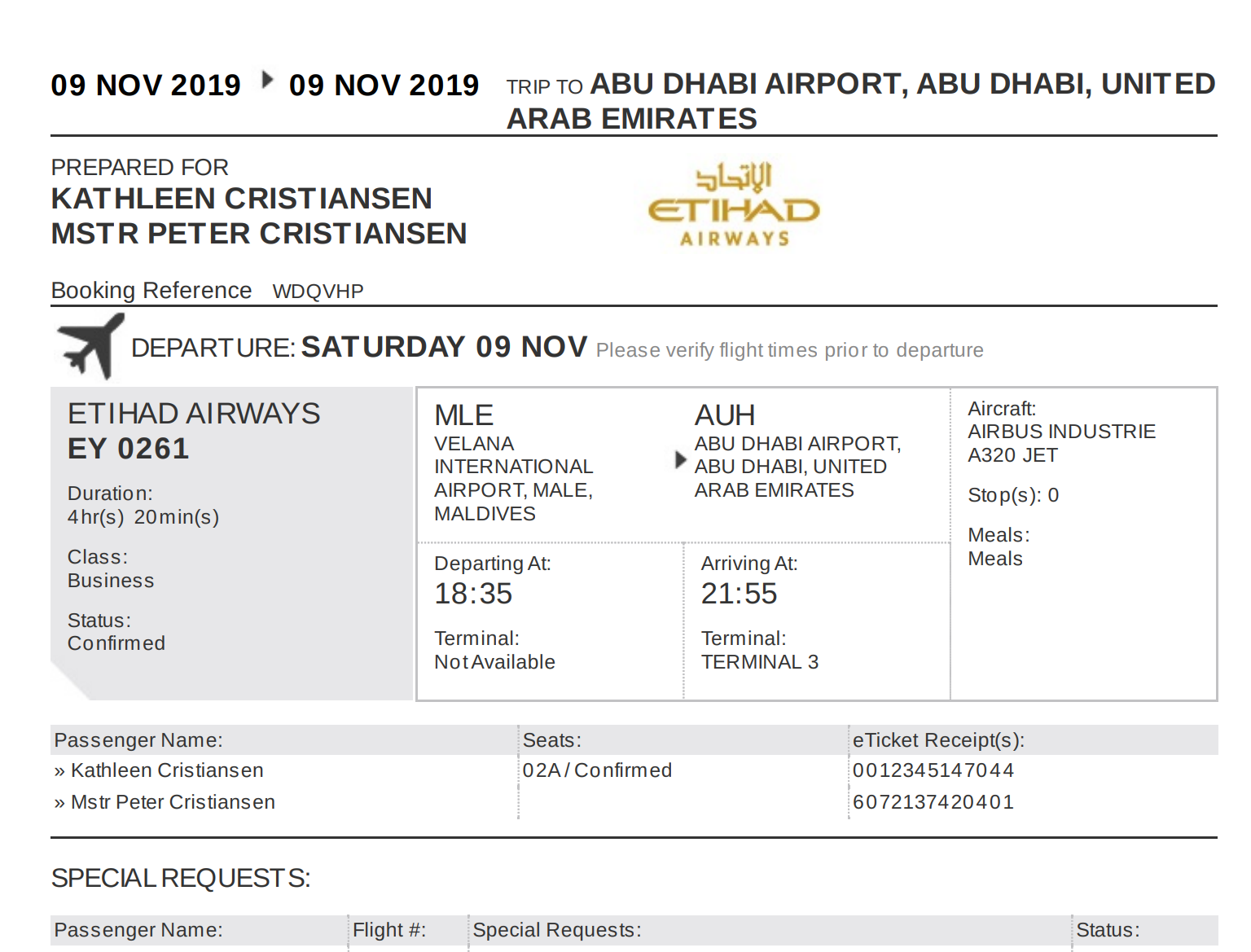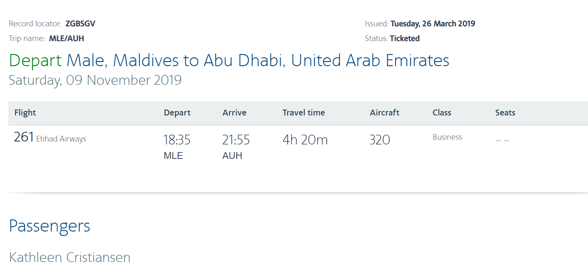 First, I booked a flight from the Maldives to Abu Dhabi in business class for 30,000 American Airlines AAdvantage miles and $72 AUD. I then called the Australian American Airlines number because they sometimes have the best view of the Etihad upper class availability. The ticket took almost 24 hours to go from pending to ticketed. Note: When you make the initial award booking with American, the airline will give you the partner airline's confirmation code over the phone. Write this down, as you'll need when you call the partner airline to add the infant's ticket.