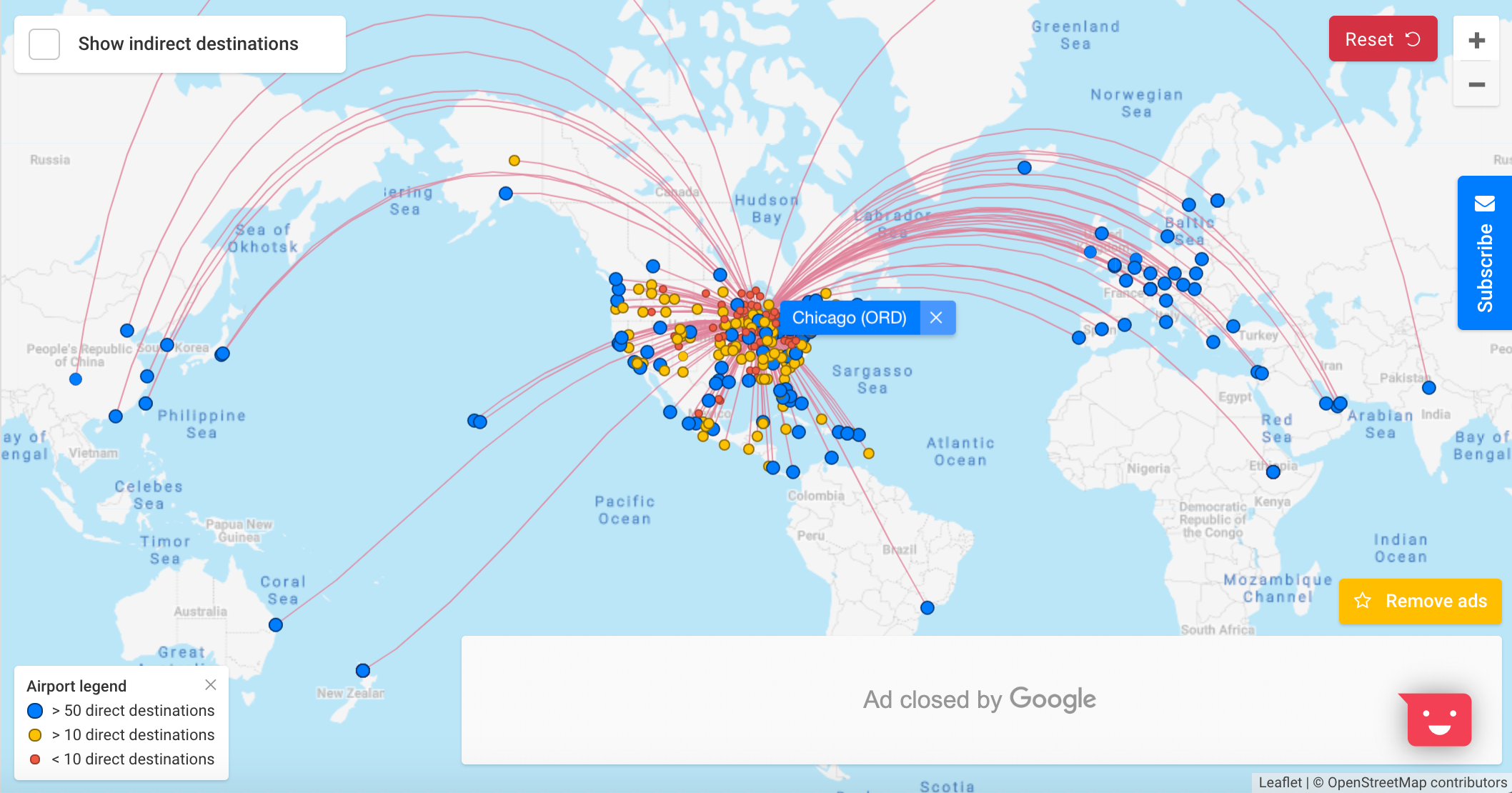 For example, let's say you were in the Chicago area and were planning your next trip. If you zoom in and click on Chicago-O'Hare (ORD) on the map, the results will be a staggering mess of lines that touch every continent on the planet not named Antarctica.