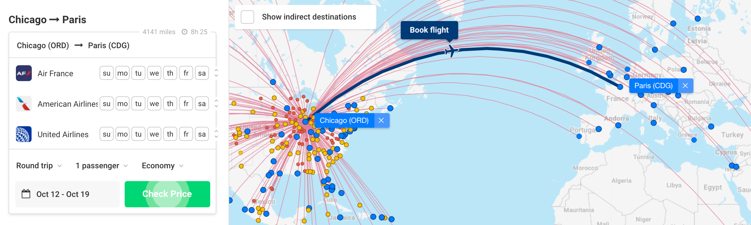 However, you could filter down to just Star Alliance flights (for example) or even those operated by a single carrier. And when you click on an individual destination, the flight options will populate on the left, like this example from Chicago-O'Hare (ORD) to Paris (CDG):