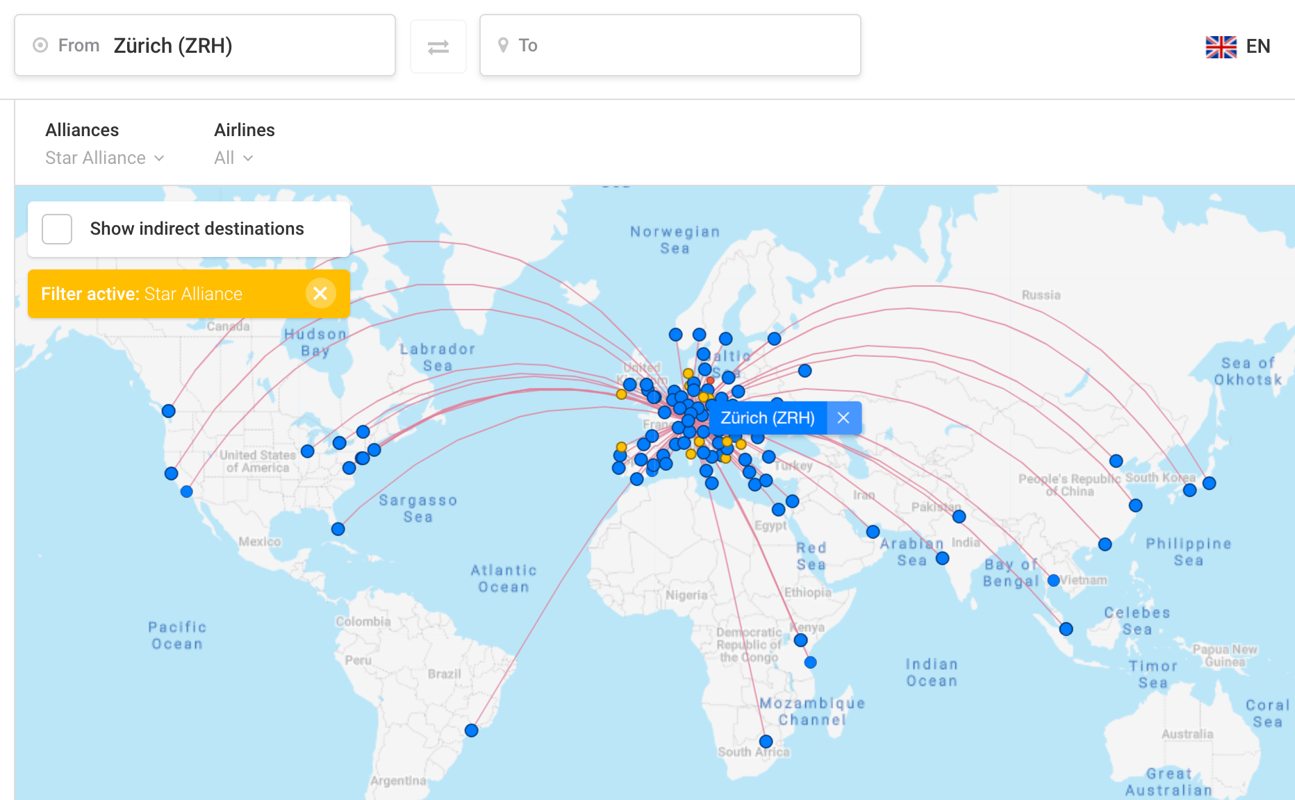 I typed in "ZRH" at the top, then filtered to only show Star Alliance flights.