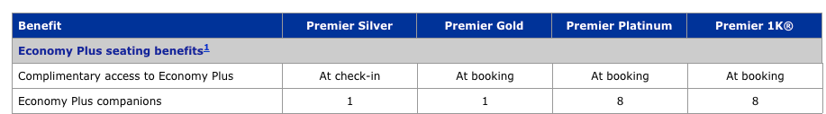 Complimentary Economy Plus Seating — Available to Premier Silver (at 24 hour advance check-in) and Premier Gold (at booking) members and one companion. Premier Platinum and Premier 1K members can extend this benefit to up to eight others traveling together at the time of booking.