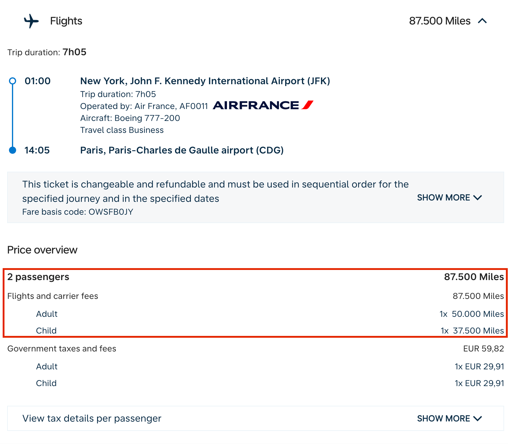 For example, if you booked a 50,000-mile business-class award to Europe for one kid and one adult, the kid business-class award ticket would only cost 37,500 miles, which is excellent.