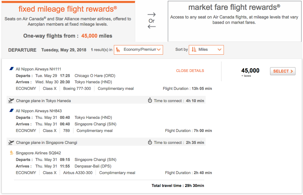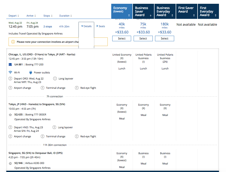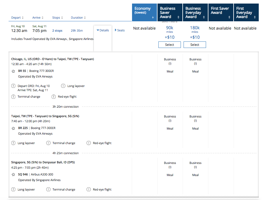 Now for the fun part: mixing and matching awards. As you might have noted from the list of airlines flying to Bali above, the only Star Alliance carriers that fly both to the US as well as to Bali are EVA and Singapore Airlines. That would seem to limit your options, but you can also mix up your carriers and fly, say, ANA to Singapore via Tokyo then Singapore Airlines on to Bali like in this example.