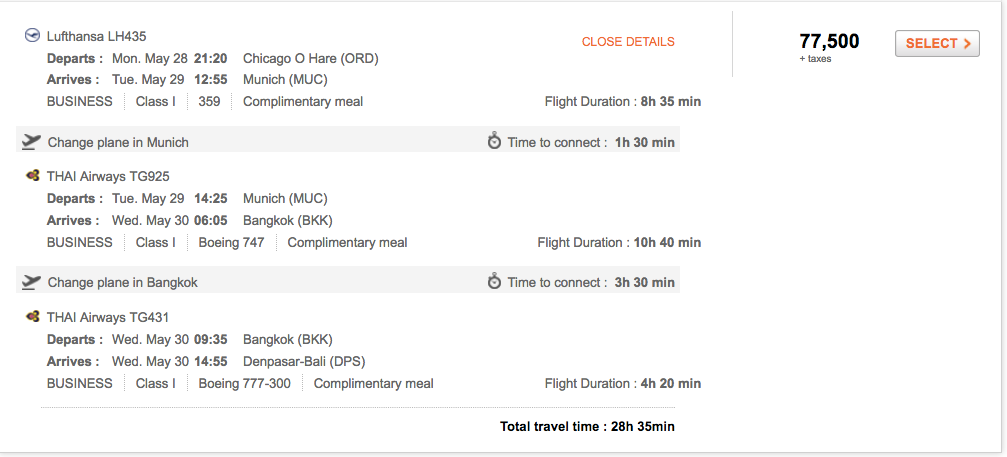Or, due to the program's lax routing rules, you could even fly via Europe, like with this business-class itinerary that includes a leg on Lufthansa's A350.
