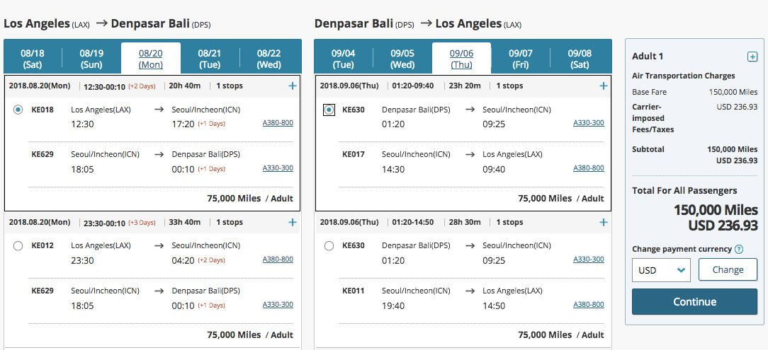 Just note that these mileage amounts are for Korean's off-peak (i.e., saver-level) awards, but that peak awards like over the summer can be much higher. Here's a sample round-trip award from Los Angeles (LAX) to Bali in August/September — as you can see, there is plenty of award availability on several flights.