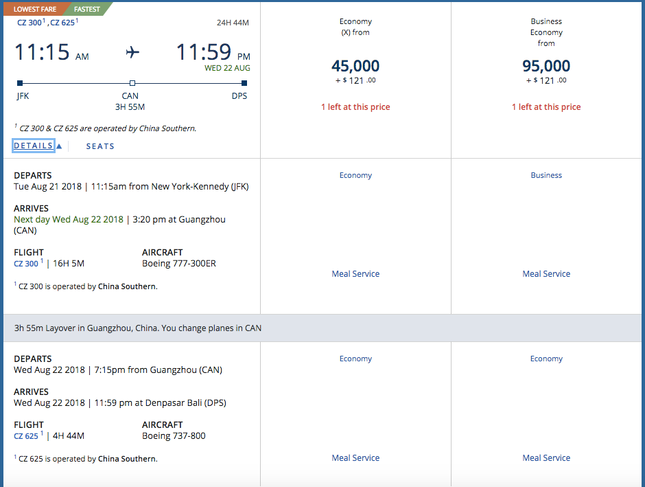 Here's a sample economy award from Atlanta (ATL) to Bali on a mix of Korean, Delta and Xiamen. Look at those taxes and fees, though!