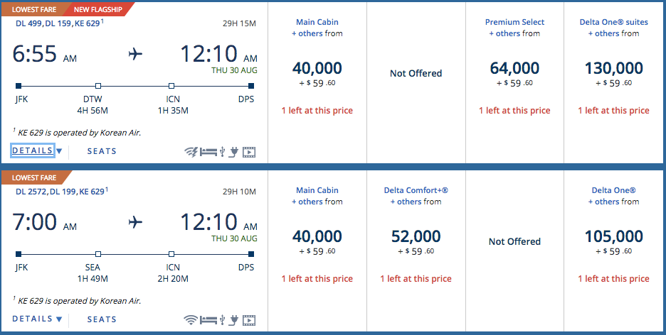 And if you have some flexibility, there are some awards on a mix of Delta and Korean, including on from Detroit (DTW) to Seoul (ICN) on Delta's A350 flight for that 40,000-mile level in economy and about 105,000 miles in business.