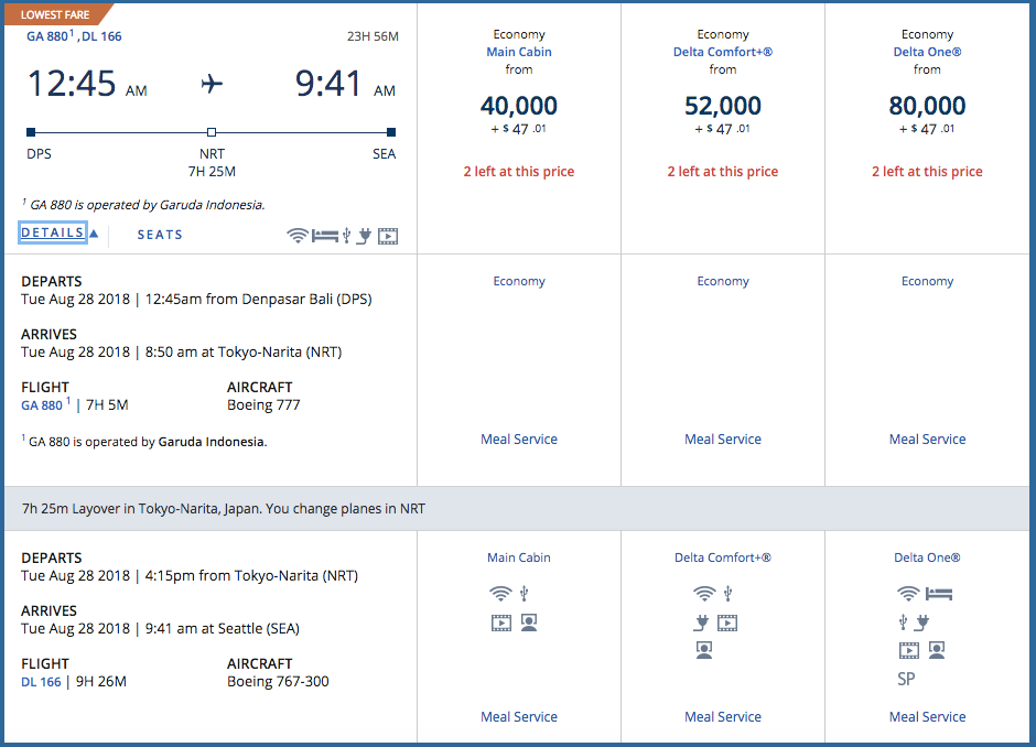 And just for variety, here's a one-way flight on the return from Bali to Seattle (SEA) via Tokyo Narita (NRT) on a mix of Garuda and Delta with availability in both economy and business class.