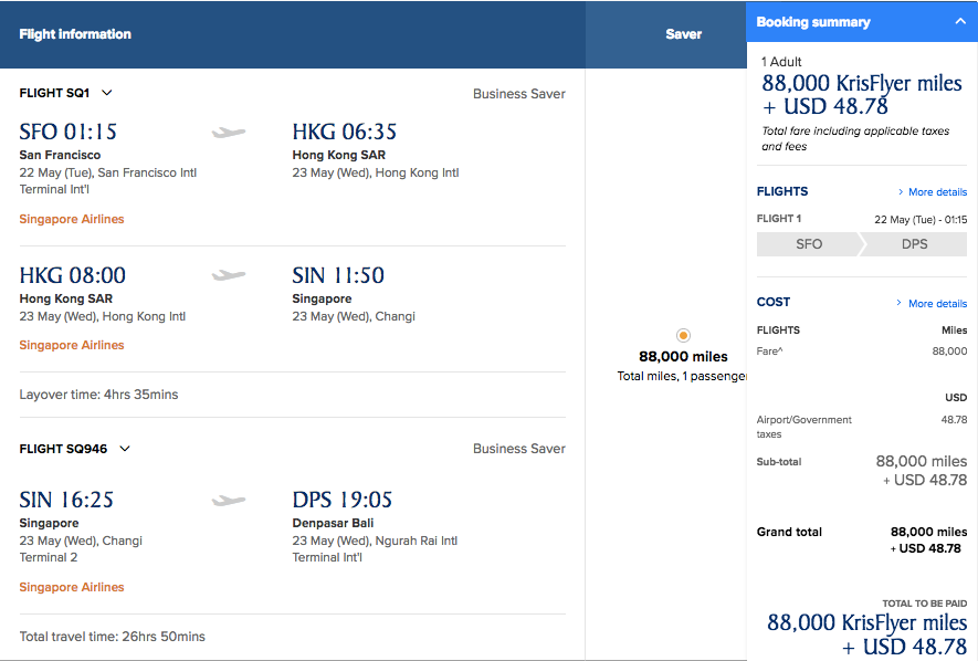 Here's a sample business-class award using KrisFlyer miles from San Francisco to Bali via Hong Kong and Singapore.