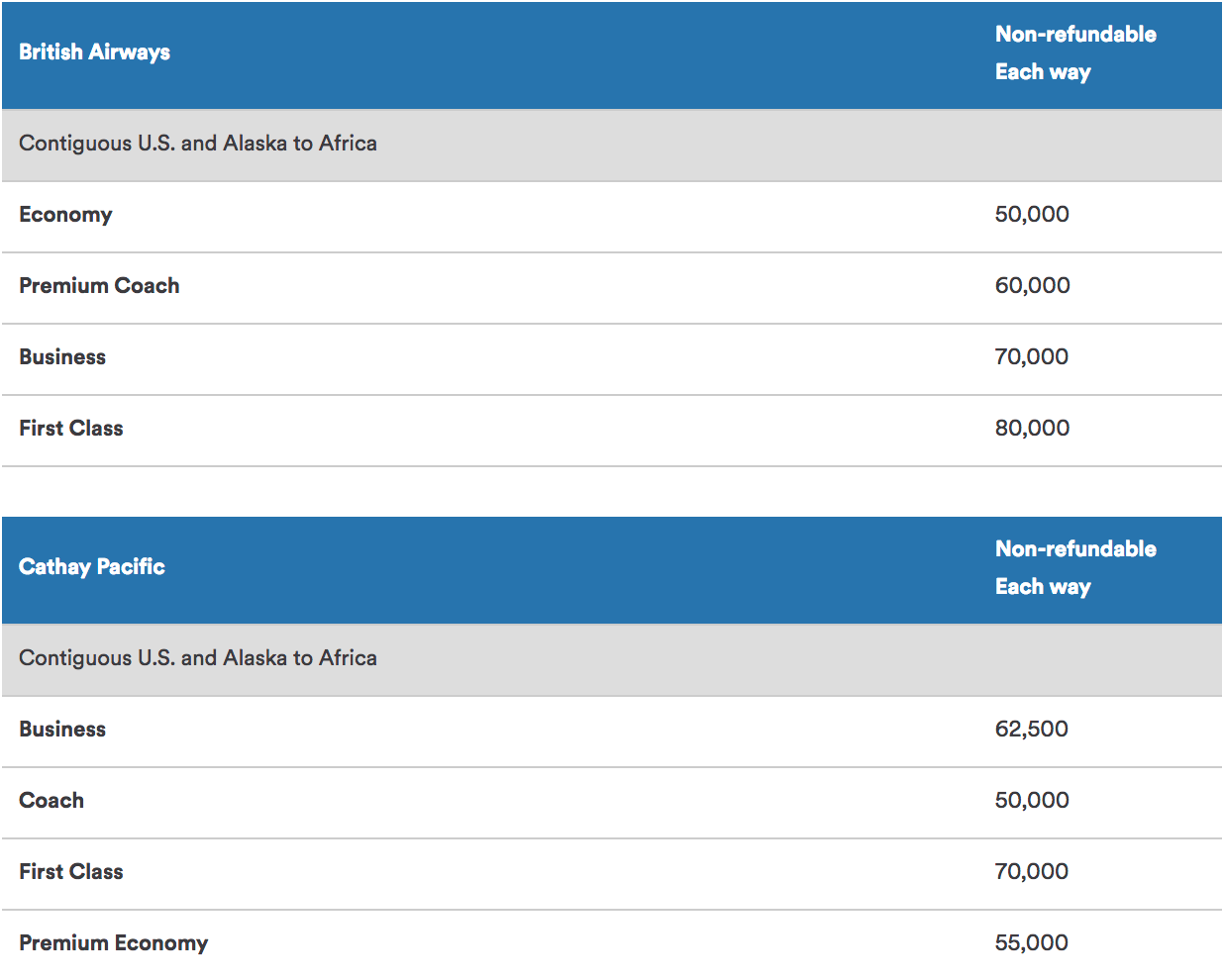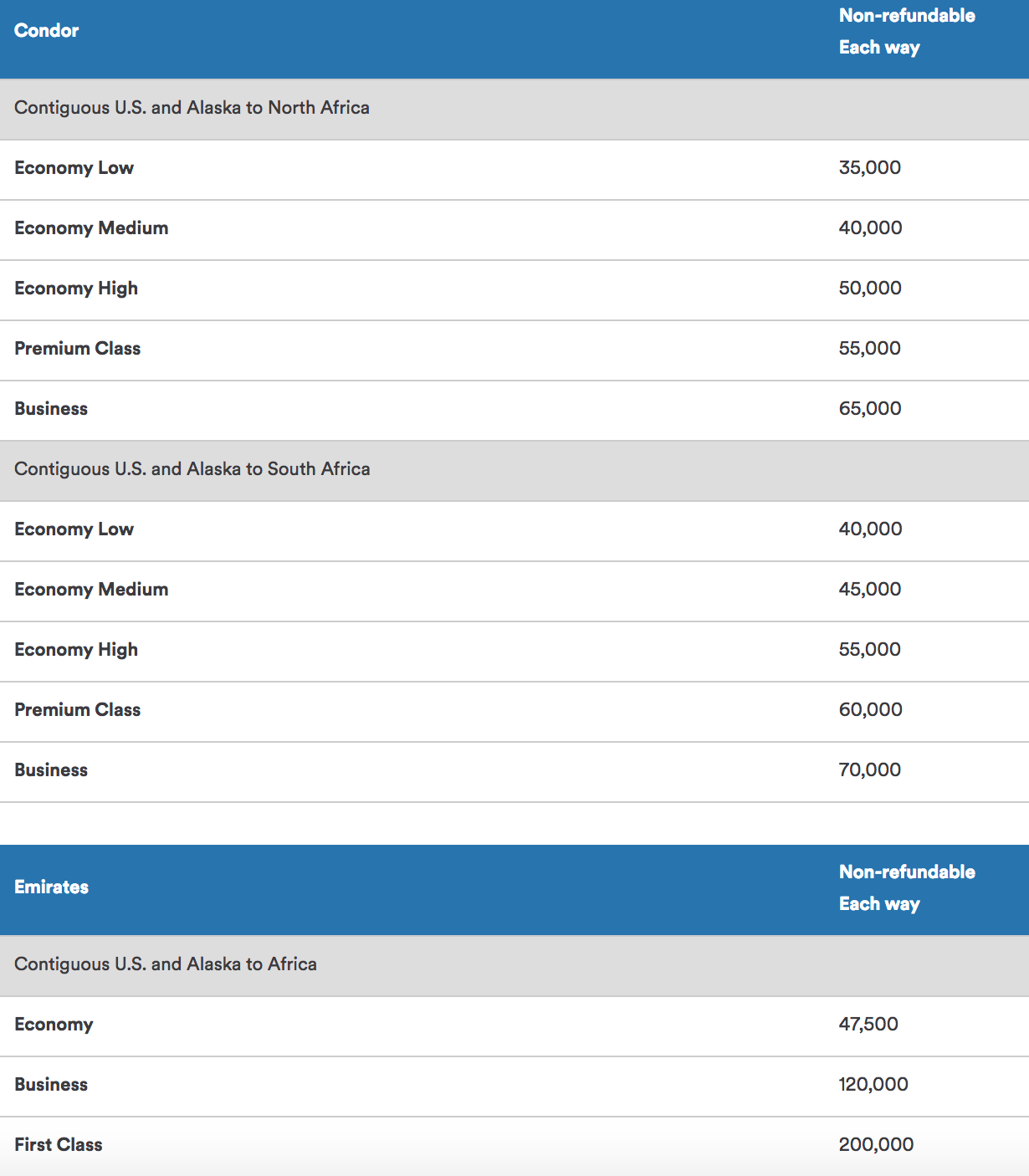 (Note the two separate award charts for flights on Condor and make sure you pay attention to the one for South Africa.)
