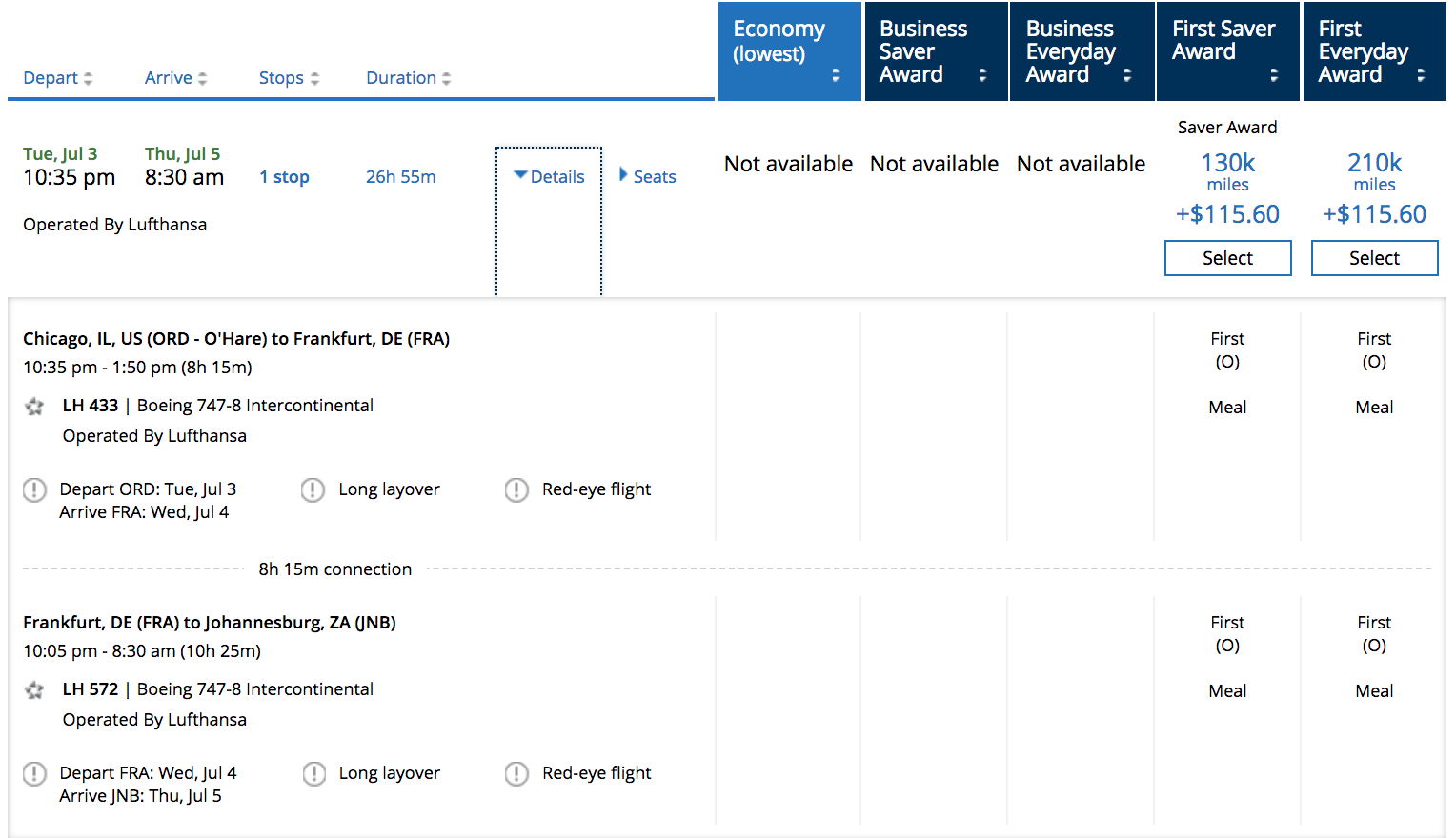 Not only will you have eight hours to kick back in the private Lufthansa First Class Terminal in Frankfurt, but you'll enjoy nearly 20 hours of flying time on the Queen of the Skies, the 747-8. Saver economy space can be hard to come by on these routes, and it might be worth upgrading to business or first class to avoid a 2-stop routing.