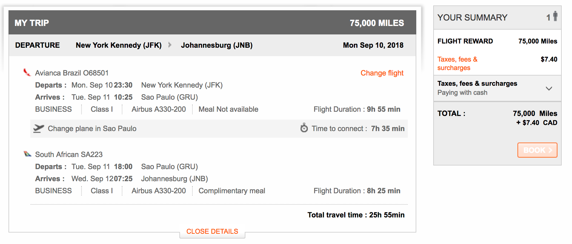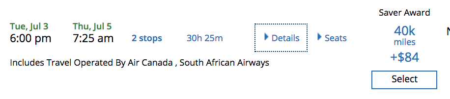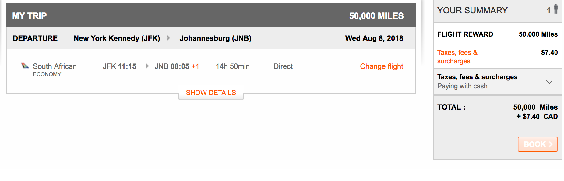 Best of all, SAA doesn't have carrier surcharges for Aeroplan award tickets, so if you can find availability on the nonstop flight out of JFK, it'll only cost you 50,000 miles and ~$5 in taxes in economy.