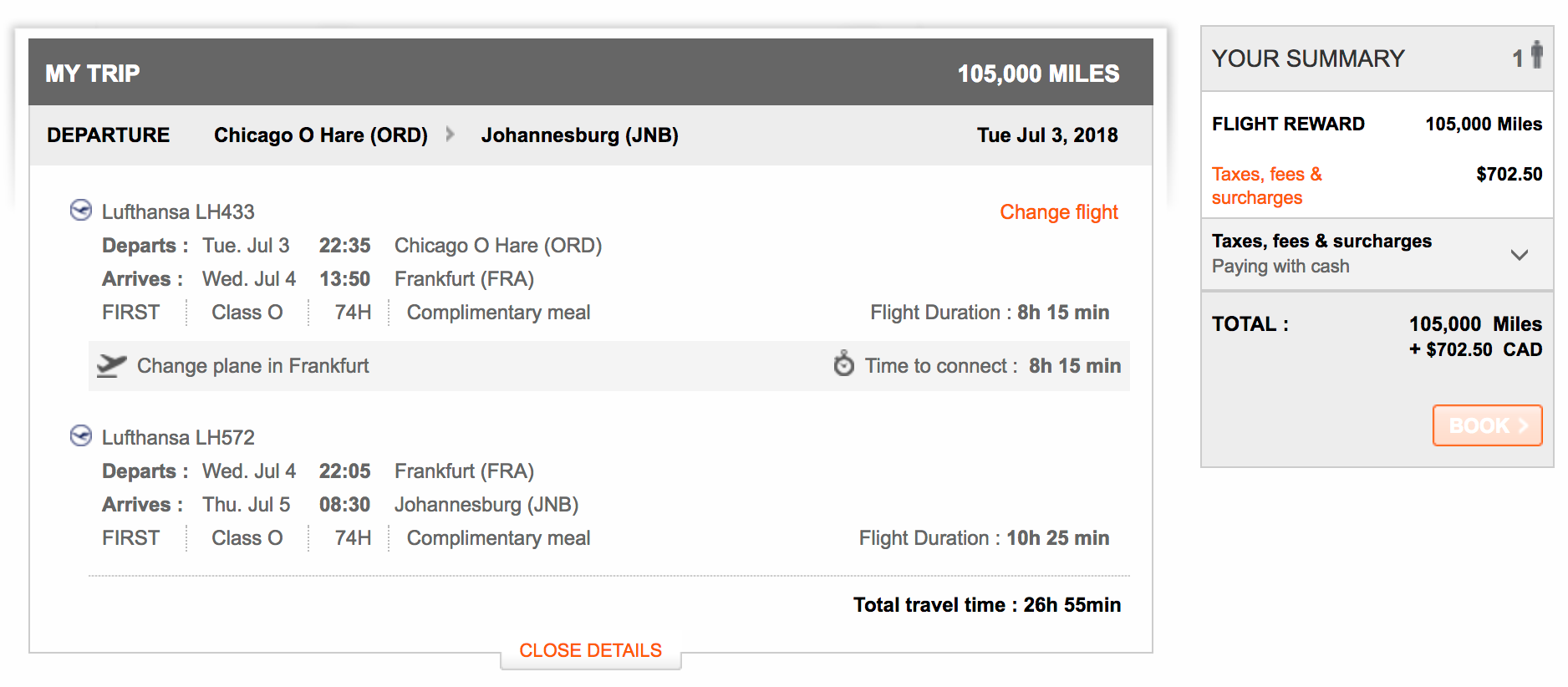 While this Lufthansa first class voyage looks like a steal at 105,000 miles — especially compared to its $13,000 cash price — the $702 CAD (~$532 USD) in taxes, fees and surcharges are a lot to stomach.