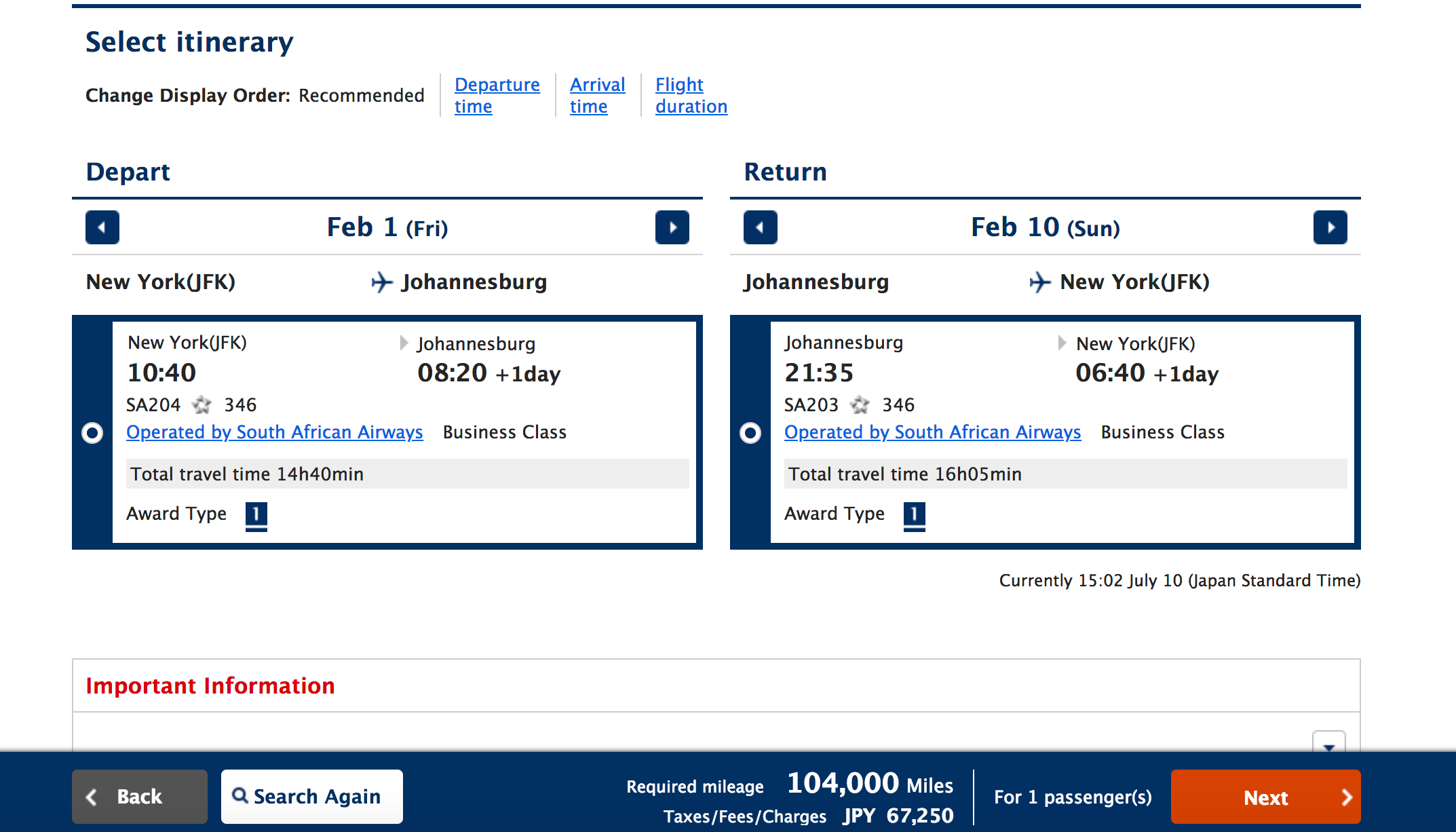 For instance, while this nonstop business class ticket from New York (JFK) to Johannesburg only costs 104,000 miles round-trip, the $600+ in taxes and surcharges can ruin the value for many people. Still, this option is definitely worth considering if you're looking to spend a little extra cash to save some miles.