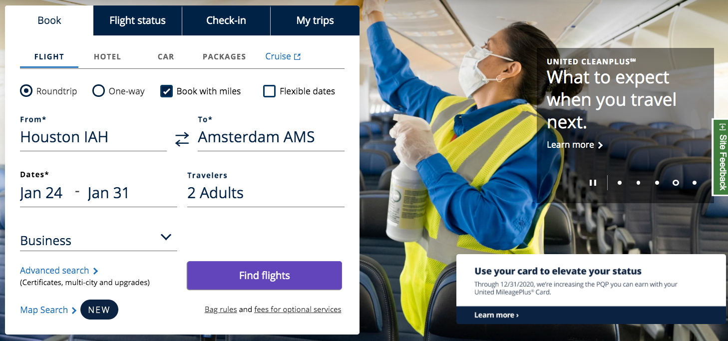 If you are using United miles to fly from Houston (IAH) to Amsterdam (AMS) in business class, you'd search on the United homepage and again click the "Book with miles" box.