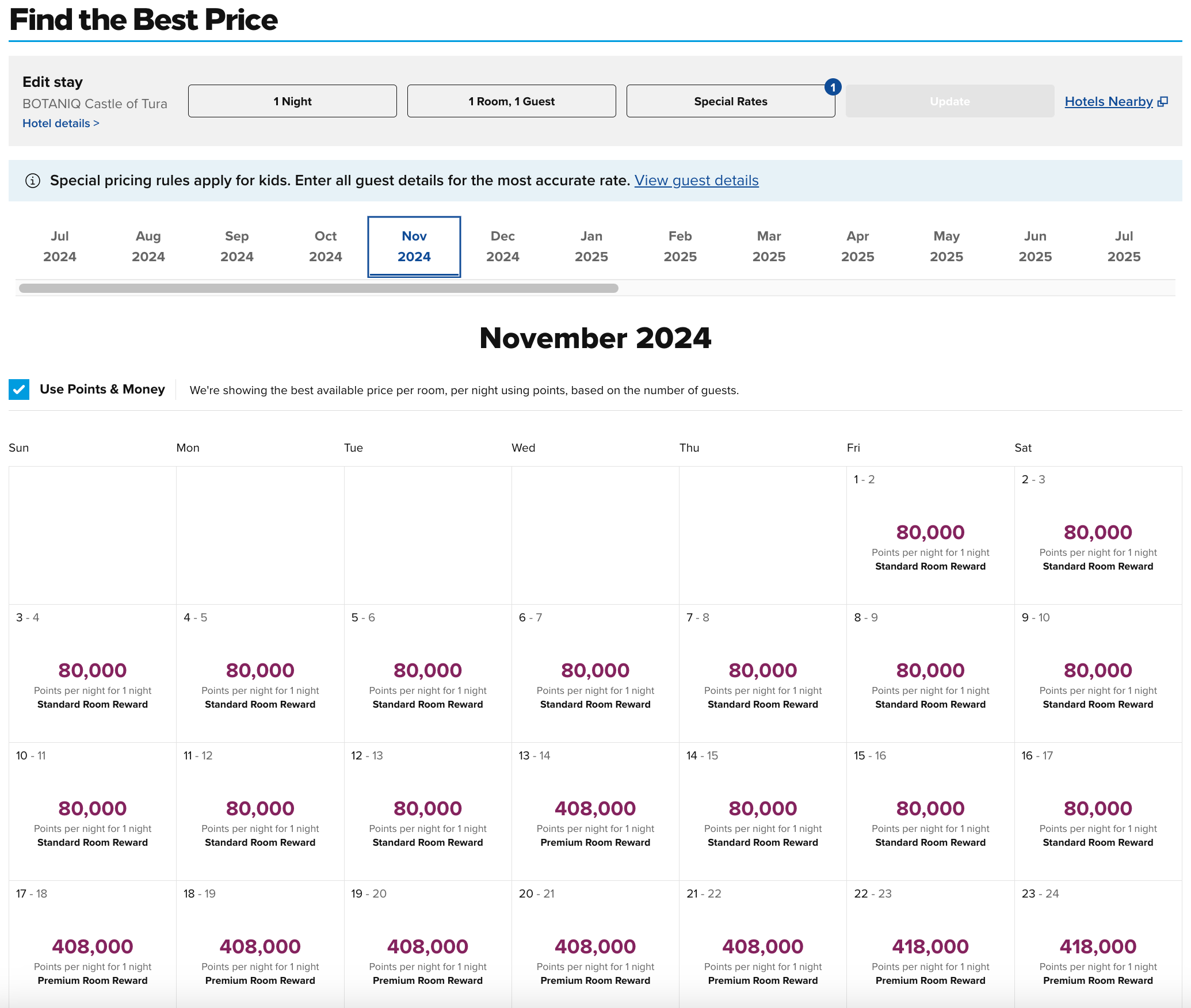 For example, you can experience your own fairy tale in Hungary's Botaniq Castle of Tura for just 80,000 points per night for a standard award room or a cash rate of $468 per night. This would give you a redemption rate of 0.59 cents per point, which is close to TPG's July 2024 Hilton Honors valuation of 0.6 cents per point. Note that premium rooms in November start at 408,000 points per night or a cash rate of $831 per night. This would give you a value of 0.2 cents per point, which is significantly lower than our valuation.