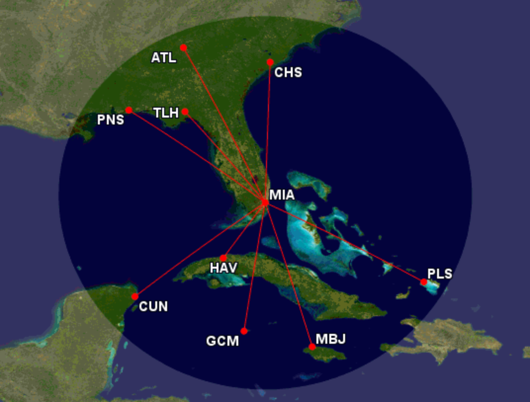 Nonstop flights that cover 650 miles or fewer in distance cost 7,500 Avios in economy or 15,000 Avios in first class, while flights between 651 and 1,151 miles are just 9,000 or 16,500 Avios in economy or first class, respectively. There is a wide variety of city pairs within the US that fall within these ranges, like these within 650 miles of American's hub in Miami (MIA):