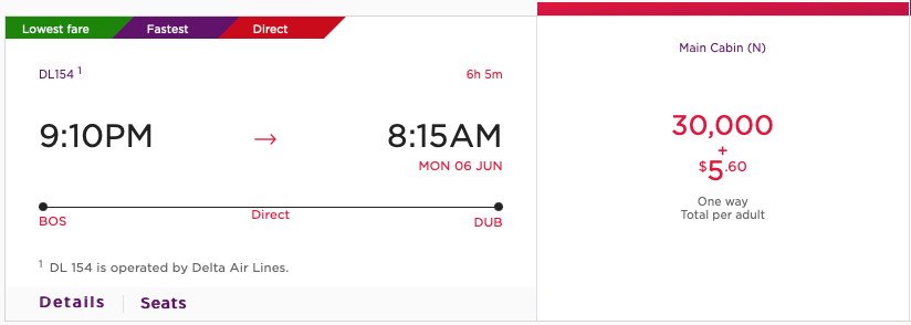 You can book these tickets for just 30,000 points one-way in economy and 50,000 points in Delta One business class, plus minimal taxes and fees. This covers virtually all Delta transatlantic flights to Europe but note that connecting flights will cost marginally more miles.