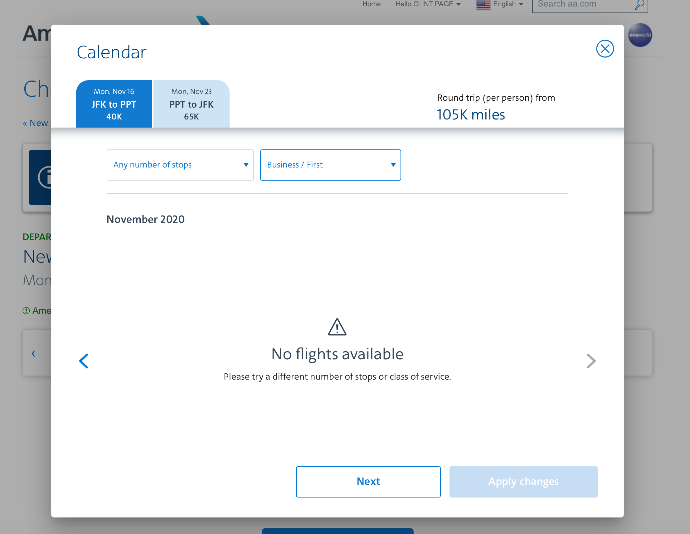 I initially settled on November for the trip, but as you can see, there was very little inventory available on American Airlines in business class or coach. I did find premium economy availability but it was priced pretty high at 130,000 AA miles with really long layovers. In fact, I found availability was very limited for most of the fall and winter in all classes, though there are some coach seats available for between 40,000 and 65,000 miles each way later in summer and late in the year.