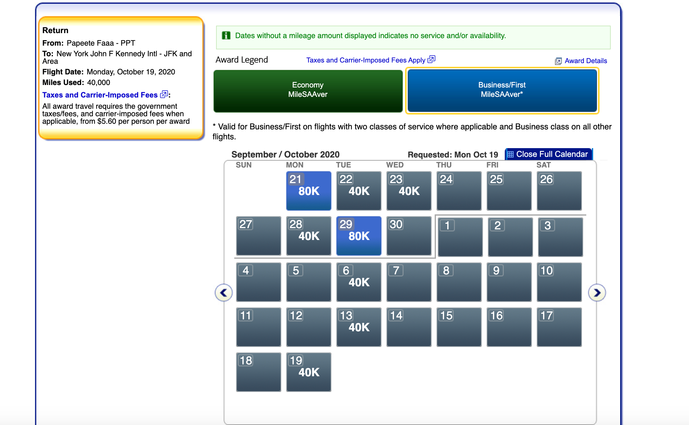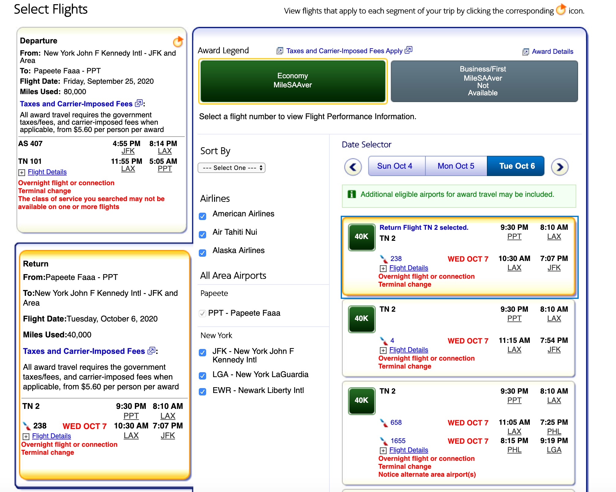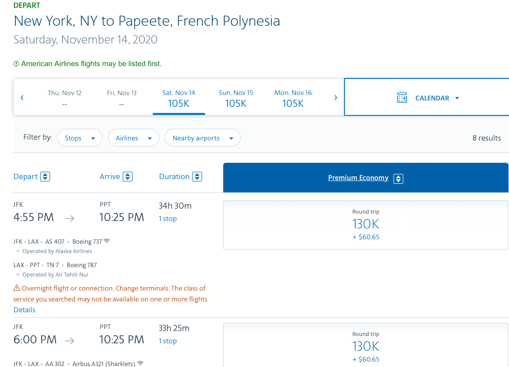 In the end, the round-trip was going to cost me 120,000 miles. Getting to Tahiti via Alaska Airlines in first class from New York-JFK to Los Angeles International Airport (LAX) and then on to Papeete International Airport (PPT) in Tahiti on Air Tahiti Nui in business class came in at a total of just 80,000 American Airlines miles. I wasn't able to get business class on the return, but did get coach for 40,000, including American Airlines metal on the LAX to JFK leg.