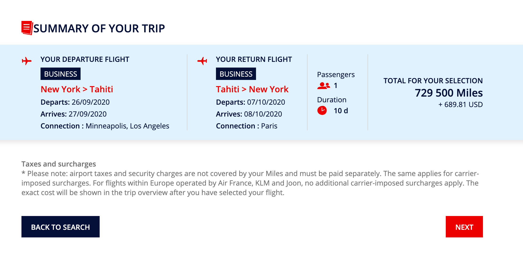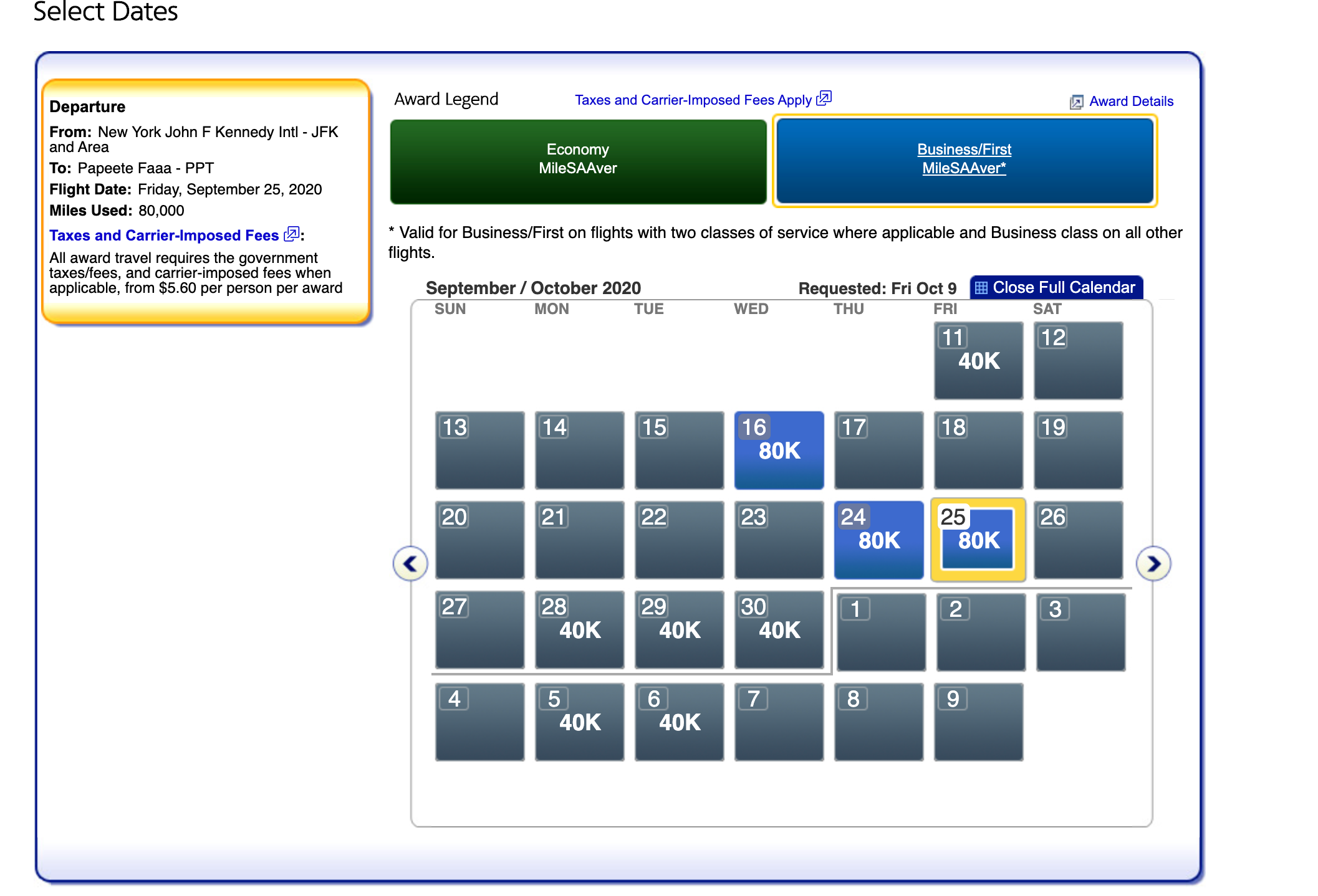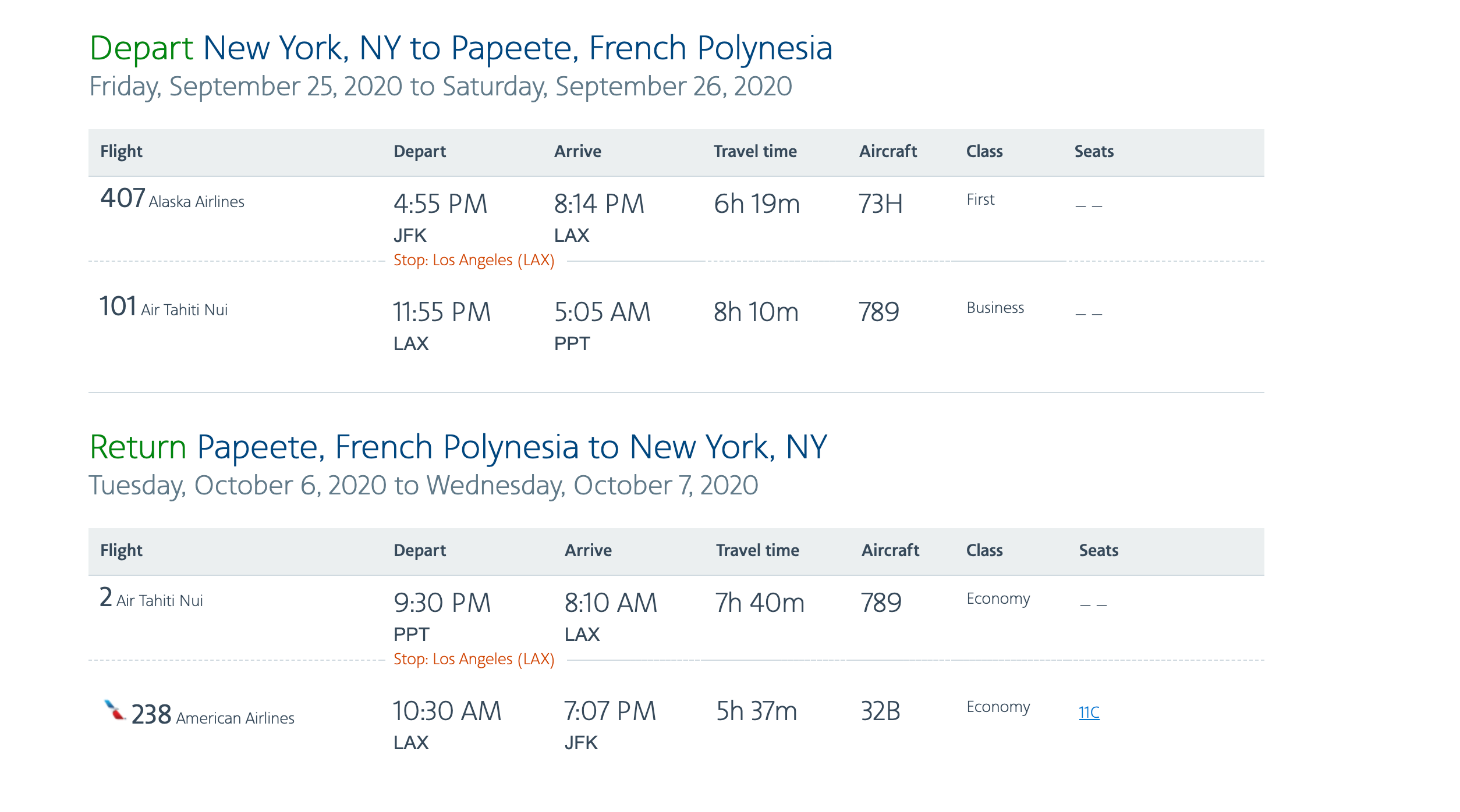 So the total ended up being 145,000 miles for a mix of first, business, premium economy and coach from New York to Tahiti and back, plus about $60 dollars in taxes and fees. I'll take that as a win!