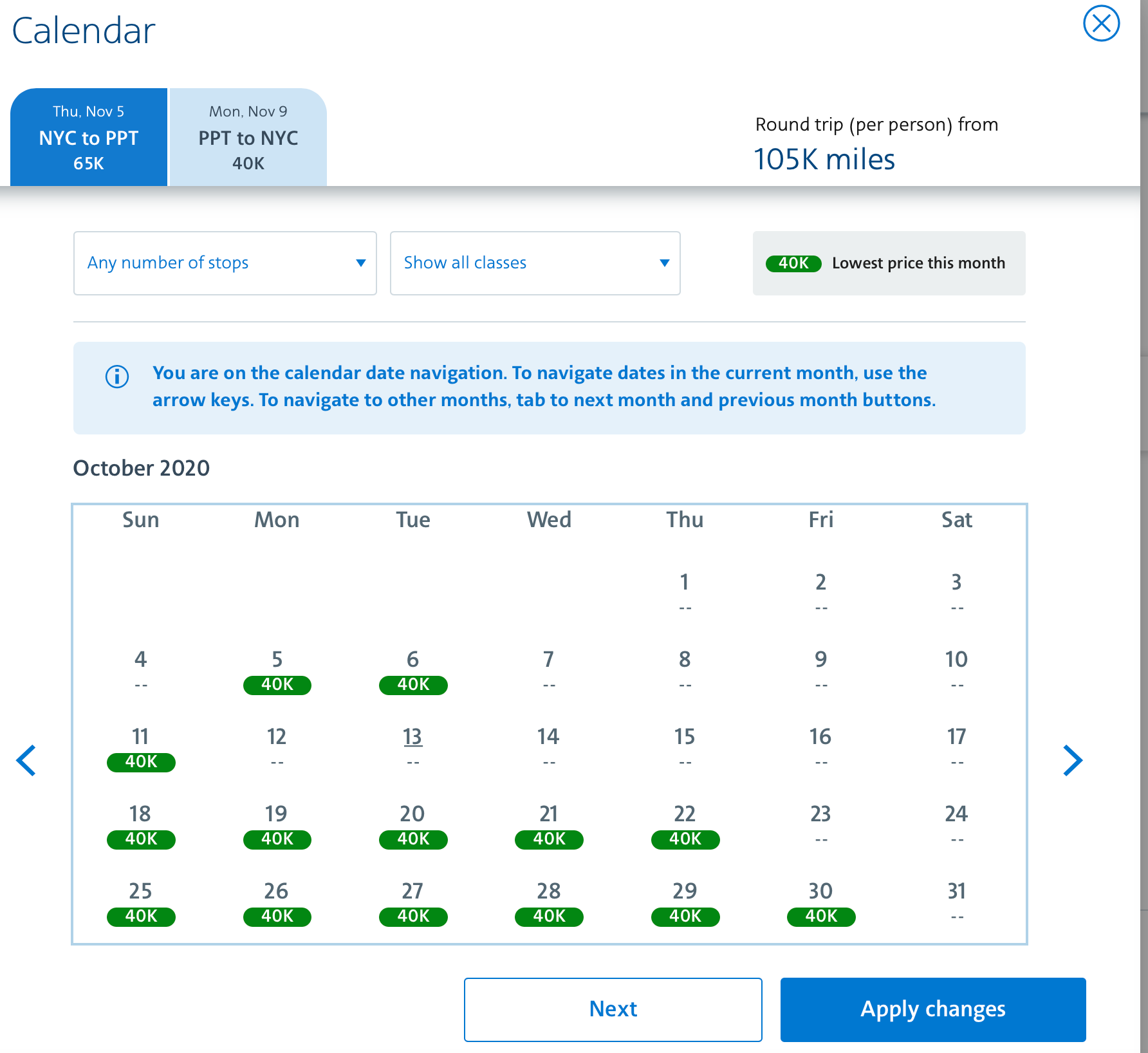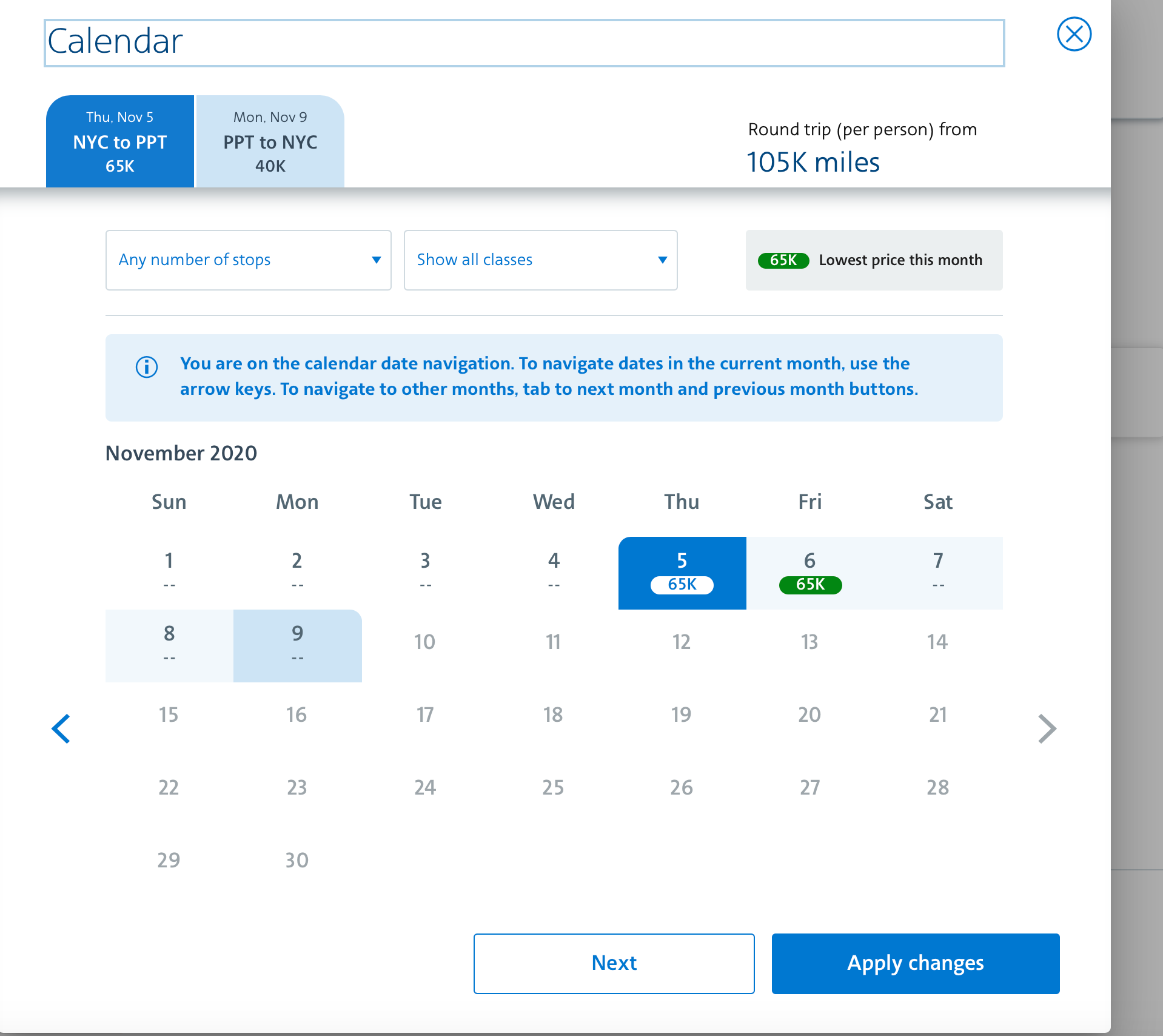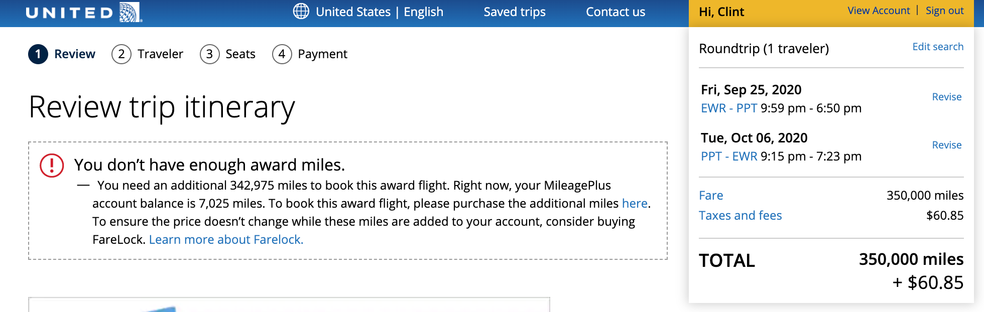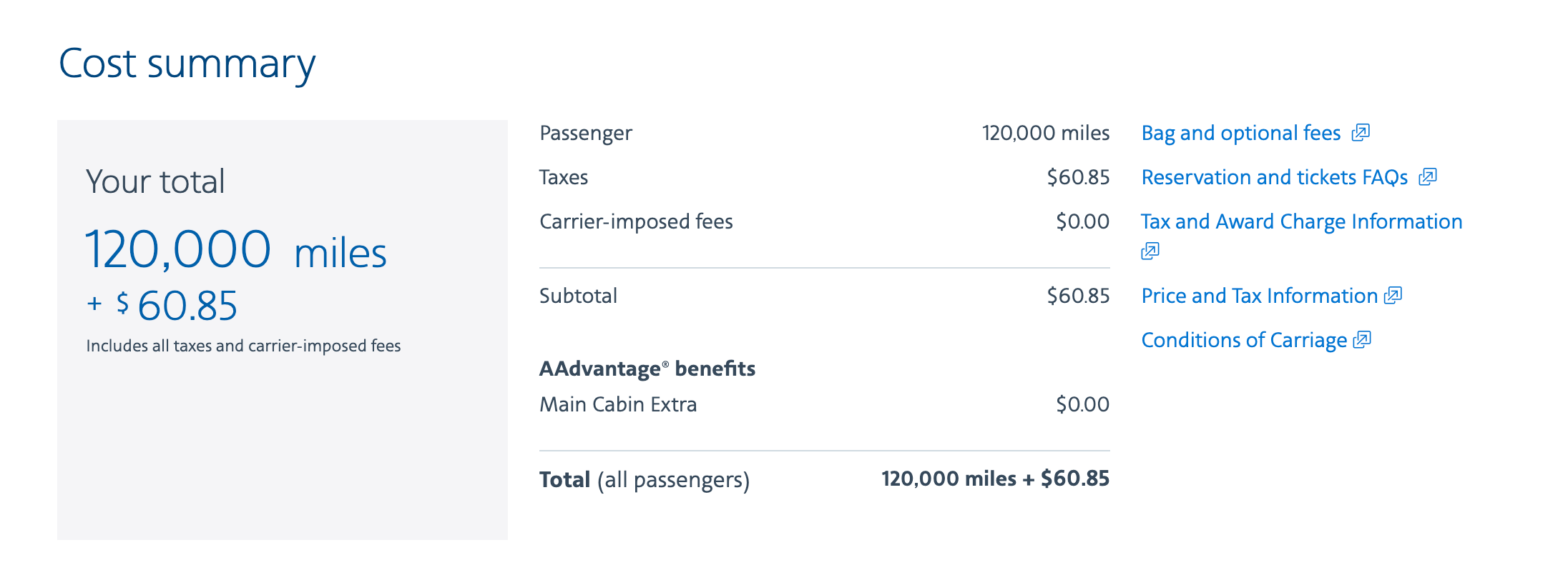 So the total ended up being 145,000 miles for a mix of first, business, premium economy and coach from New York to Tahiti and back, plus about $60 dollars in taxes and fees. I'll take that as a win!