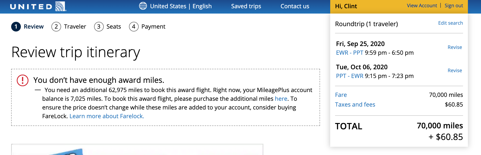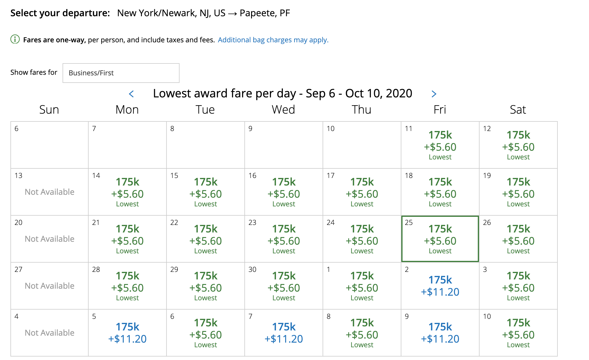There was some rare availability on United in coach. In fact, a reader sent us that tip. So if you're willing to fly coach this fall, you can score tickets on United for 70,000 United miles plus about $61.