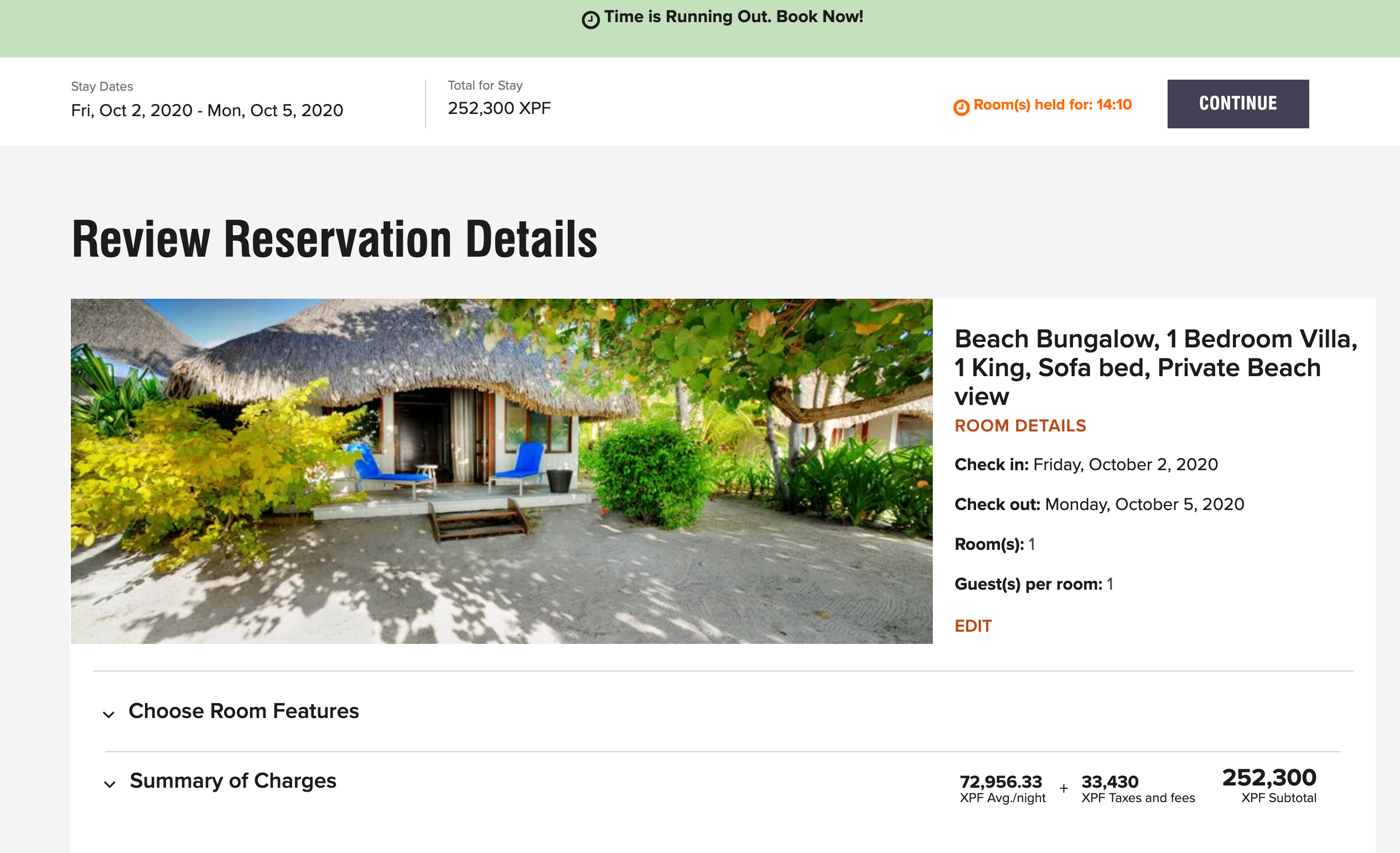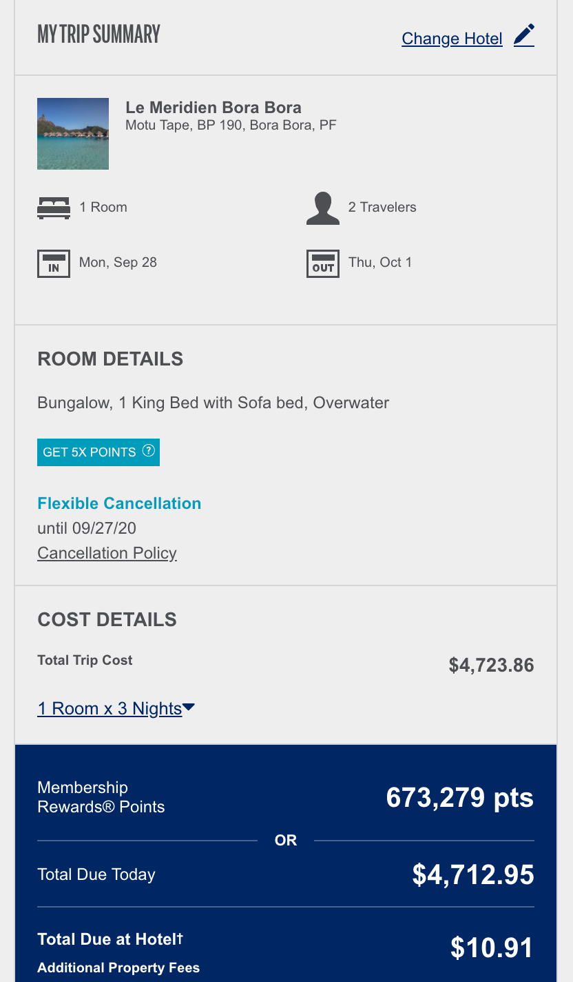 I booked two nights at Le Meridien Bora Bora using my Chase Sapphire Preferred Card for a total of about $1,428...with taxes and fees it will be more like $899 per night, the most expensive room I've ever booked.