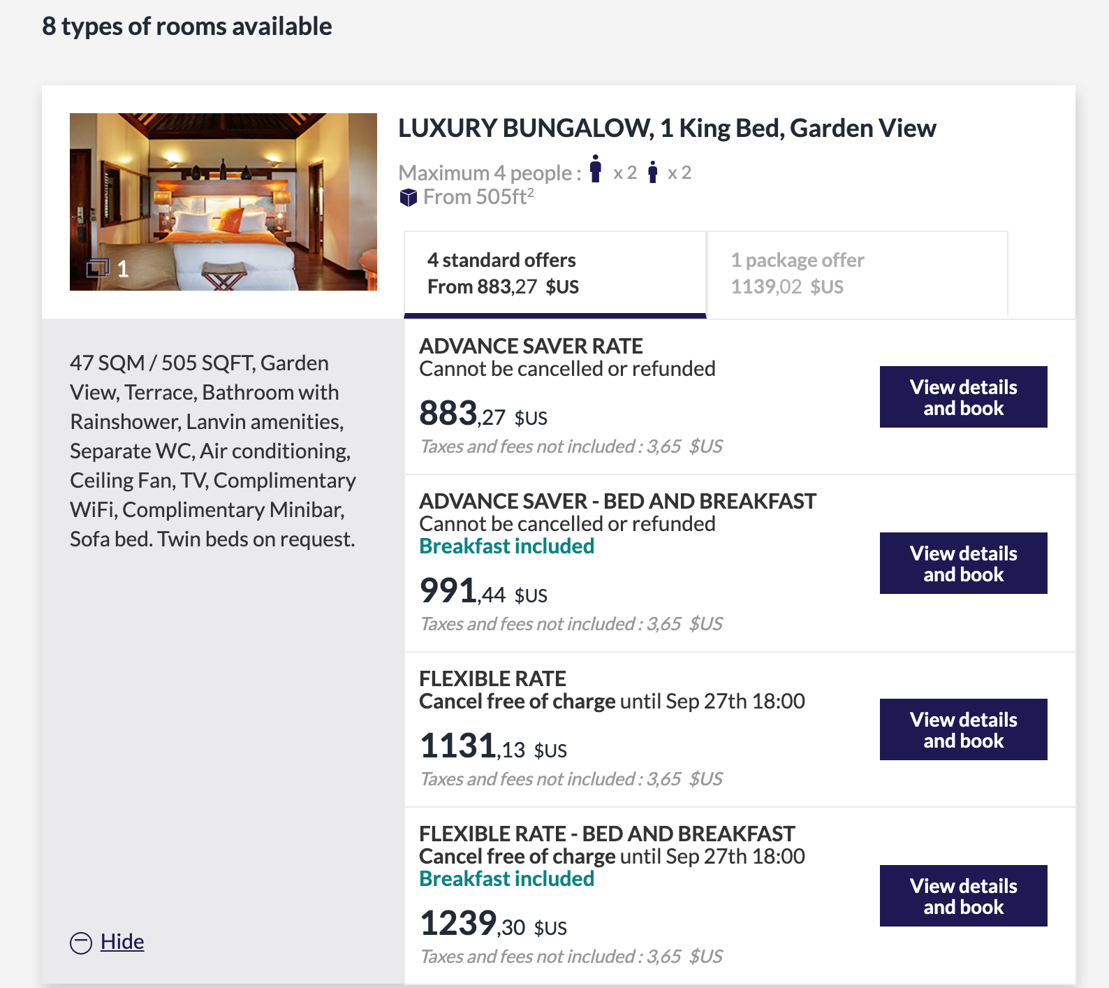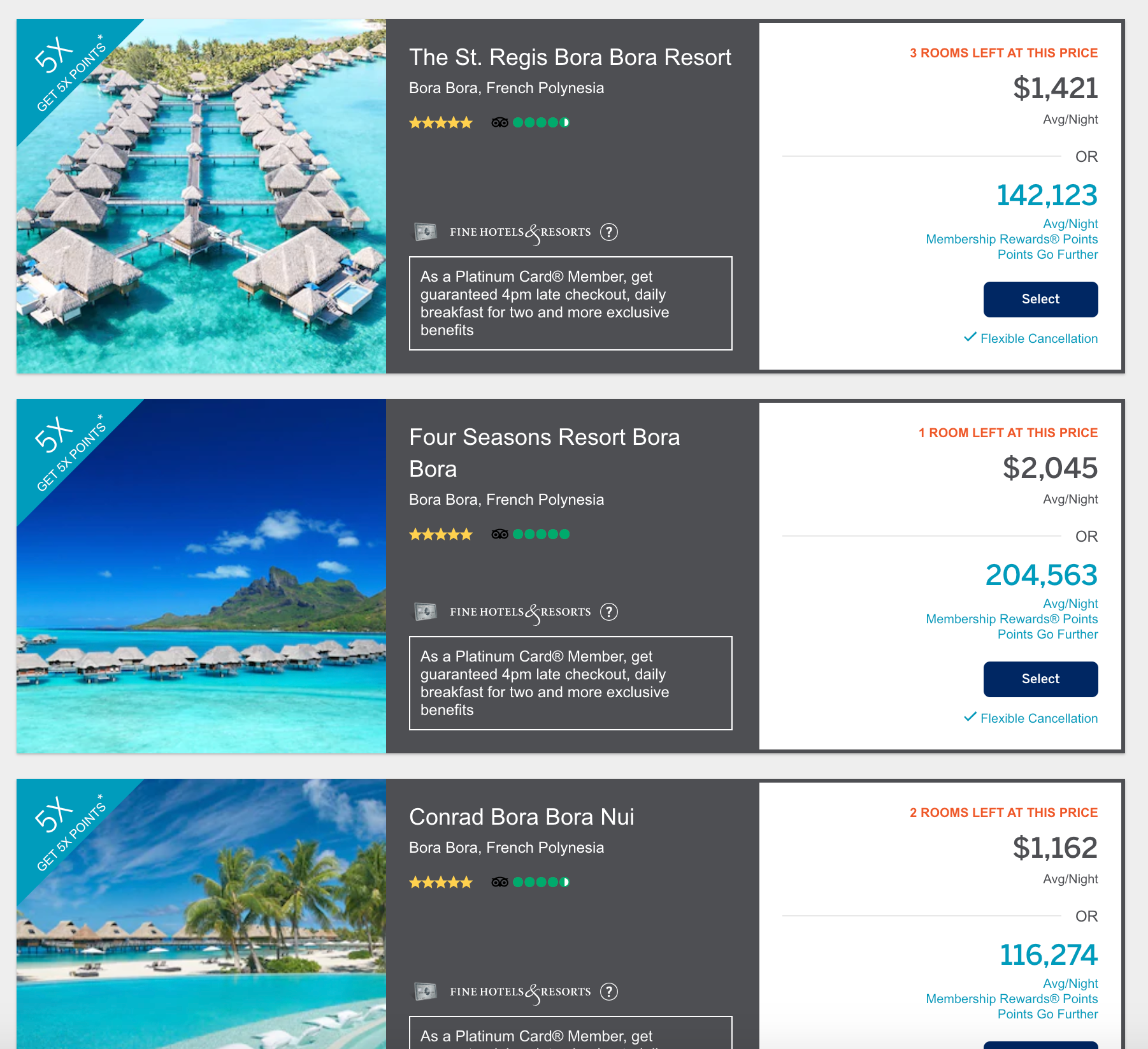 I thought prices would be lower because of the dramatic worldwide drop in travel. Boy, was I wrong. In fact, prices are even higher. For example, booking via American Express Travel, it would have been more than $4,700 for three nights at Le Meridien Bora Bora or more than 670,000 American Express Rewards Points!