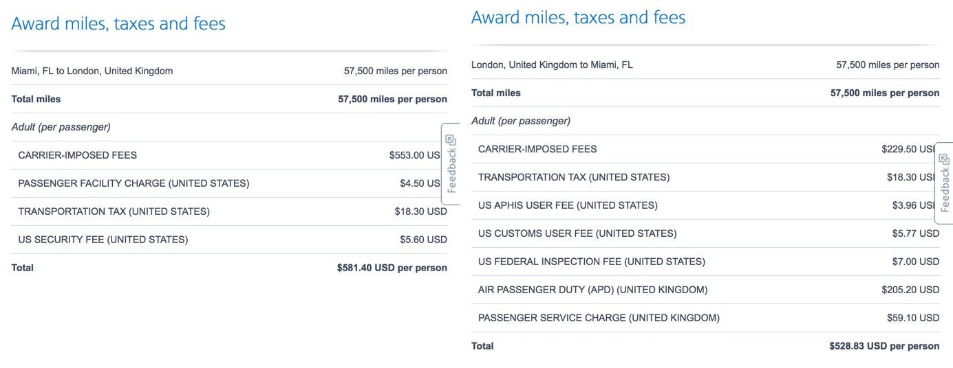 And here's a side-by-side comparison of the taxes and fees for two one-way awards on the exact same flights: