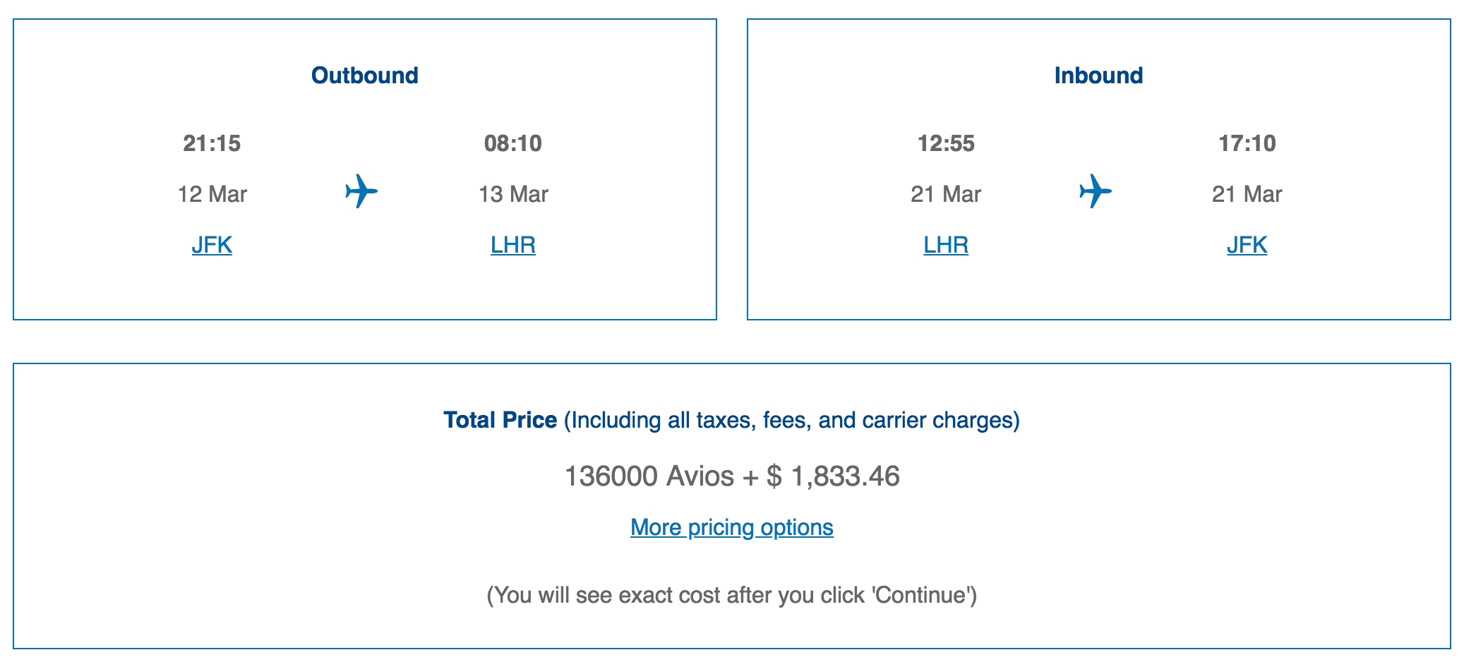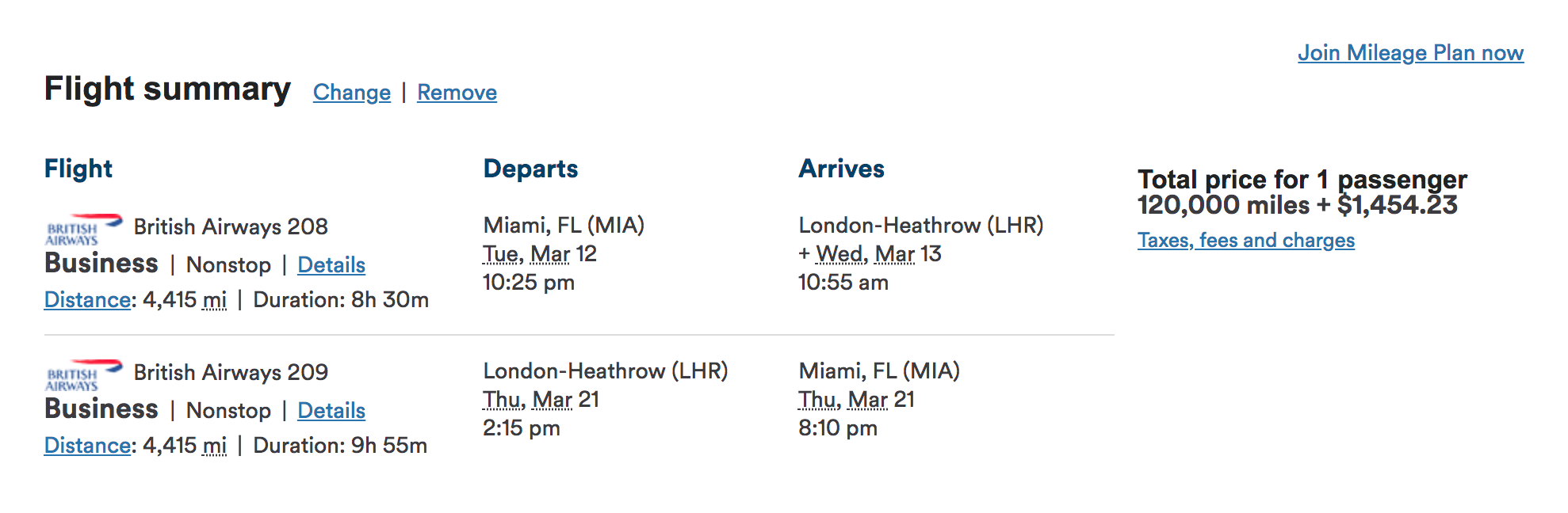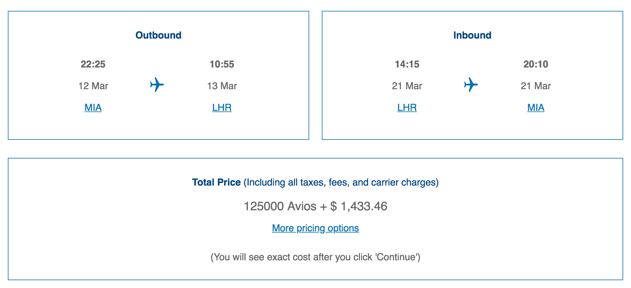 Unfortunately, this same redemption will now cost you even more. Here's a sample round-trip itinerary from Miami (MIA) to London-Heathrow (LHR) in March 2019 booked through British Airways: