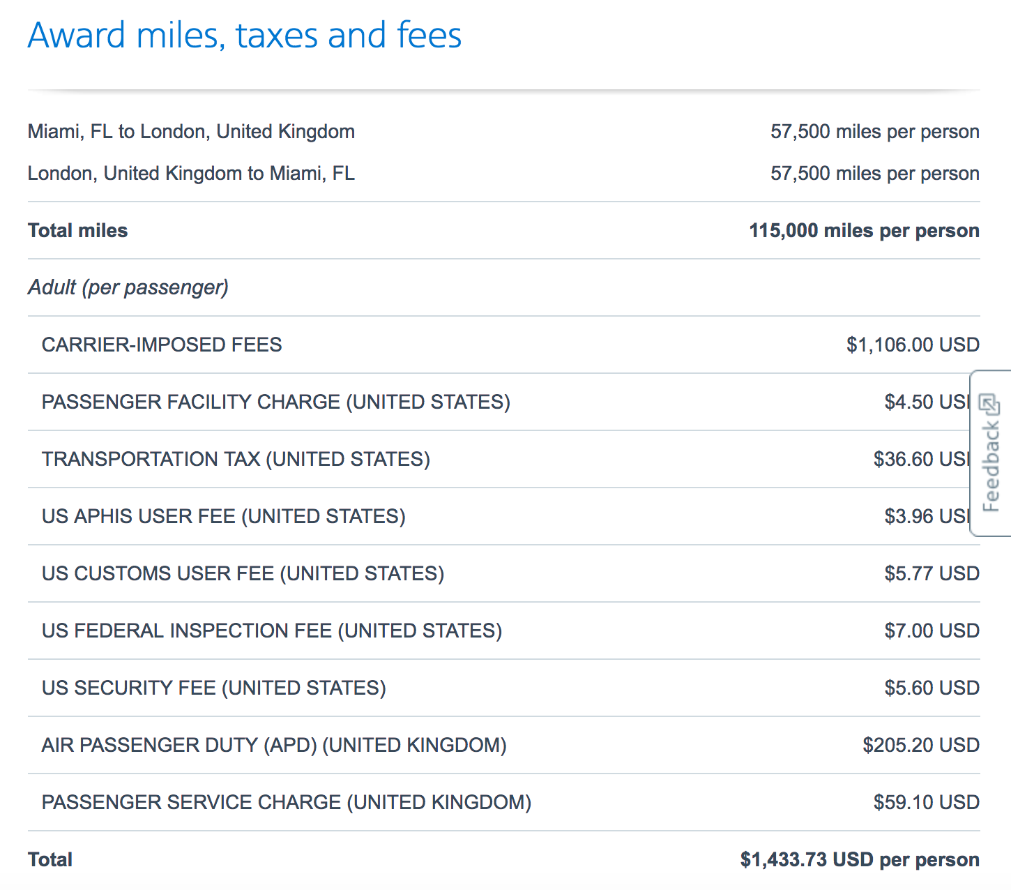 For example, here's a breakdown of the total taxes and fees for the round-trip business class itinerary above (Miami to London-Heathrow):