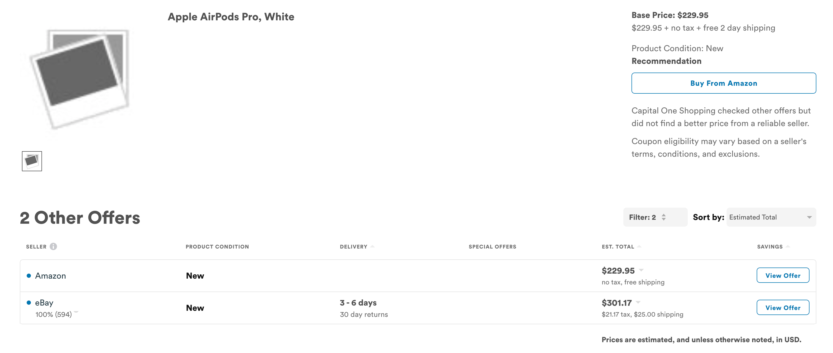 When you search by product, Capital One Shopping will display the various merchants that sell your item, including the product condition, the estimated delivery time, the potential rewards and the final out-of-pocket cost after rewards. For example, when I searched for Apple AirPods Pro, I could save over $70 when buying them from Amazon instead of eBay.