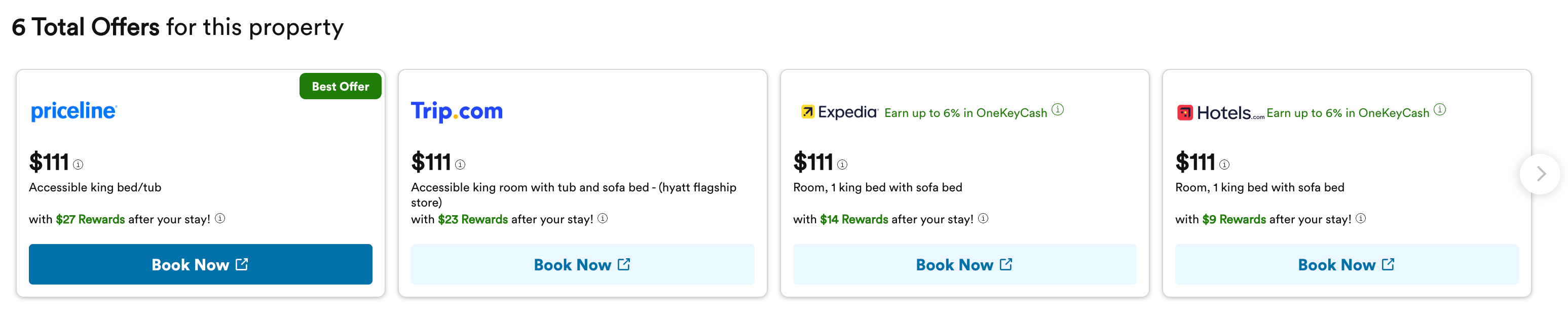 Capital One Shopping has a similar price comparison tool for hotel reservations. Start by searching for your destination and dates, then click on a hotel that interests you and scroll down to see the available offers.