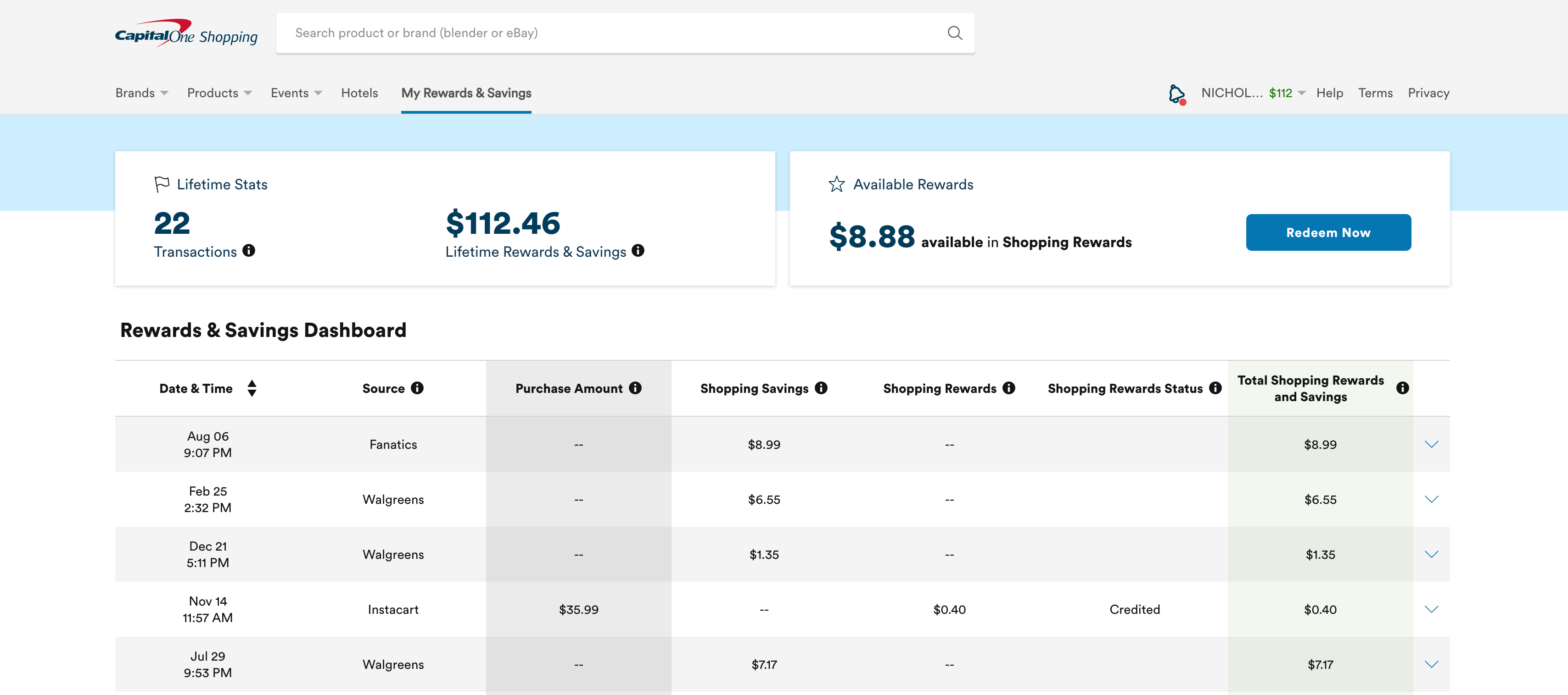 When you're ready to redeem your Capital One Shopping rewards, you can order gift cards by selecting "Redeem Now" under the "My Rewards & Savings" tab.