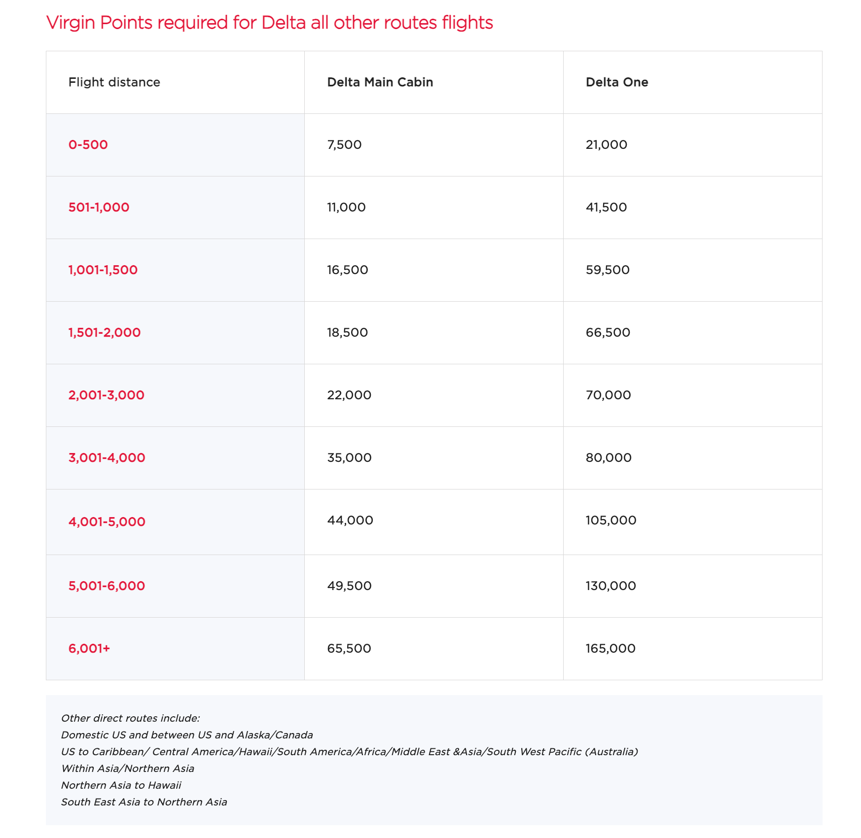 Despite the recent price increase for most non-Europe Delta flights, the distance-based chart for other Delta-operated flights can also provide value. Flights less than 500 miles in length escaped the devaluation and are still just 7,500 Virgin points per flight, a great deal.