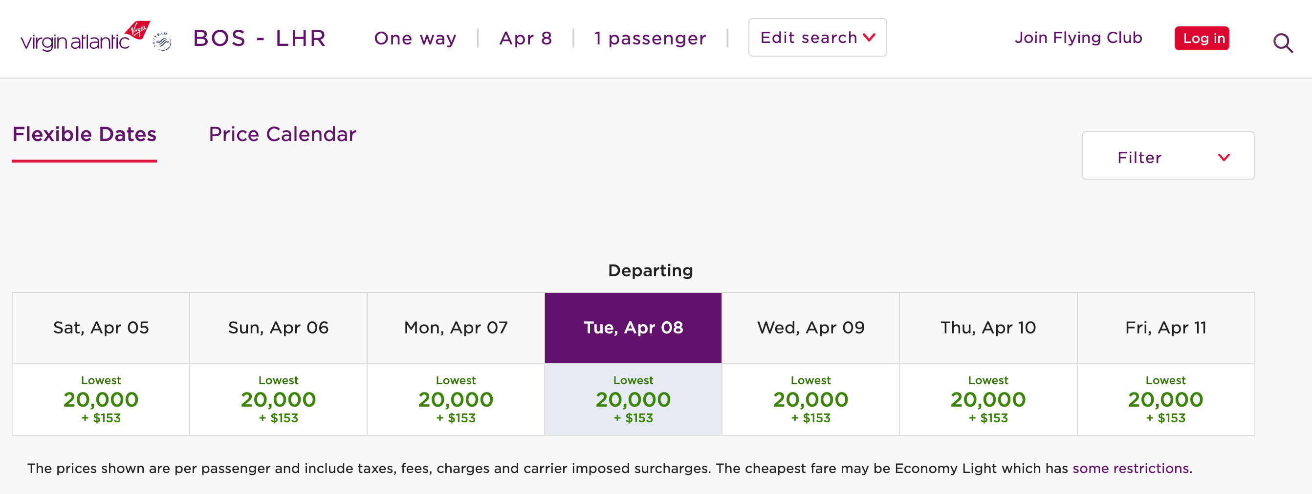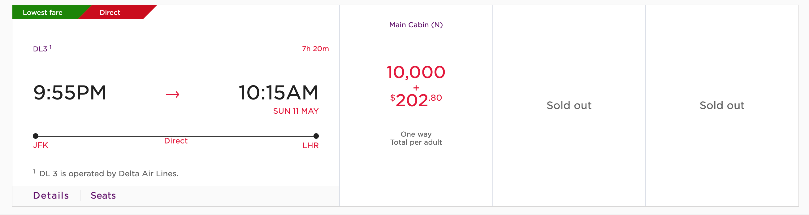 While Delta flights to London should start at 15,000 Virgin points each way, we have seen some dates go for as low as 10,000 points; however, you will have to pay carrier-imposed surcharges.