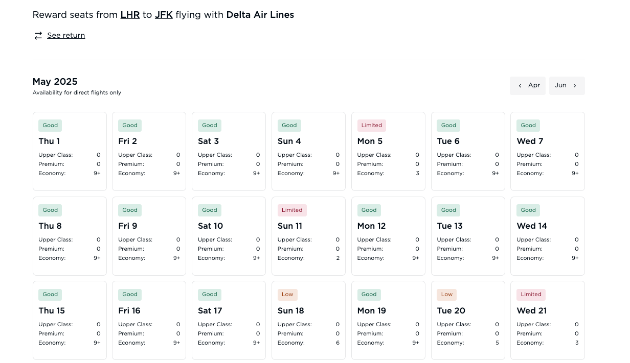 You can also use the handy reward-seat search tool to quickly check the availability of Delta flights, month by month, on routes to and from the U.K.